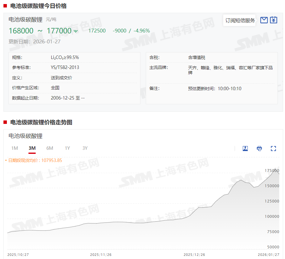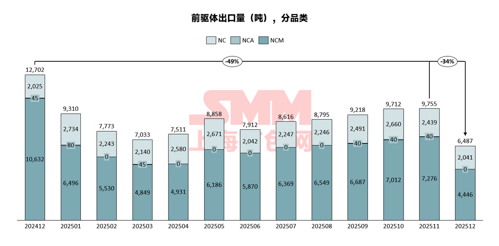 》点击查看SMM新能源产品现货报价 回顾2025年12月份,从基本面看, 供应端保持相对稳定,锂盐厂以保障长协交付为主,散货惜售;需求端下游正极材料排产虽处 高位,但受碳酸锂高价抑制,采购普遍谨慎,多依赖长协及客供渠道,散单采购以刚需为主, 仅在价格相对低点时进行适当补库。12月电池级碳酸锂日均价最高已上涨至12.2万元/吨附近。 进入2025年1月份,电池级碳酸锂现货报价整体呈现上涨态势,截至1月27日,国产电池级碳酸锂现货报价报16.8~17.7万元/吨,均价报17.25万元/吨。 碳酸锂基本面上,据SMM了解,当前碳酸锂基本面整体呈现供应偏紧的态势,临近春节,供应端部分锂盐厂开始安排检修计划,预计后续碳酸锂产量或迎来一定的缩减,而同时,下游需求端出现节前备库的情况,下游材料厂在按需采购的基础上,开始为二月份的生产进行备货,对现货需求形成一定支撑。 此外,之前财政部、国家税务总局联合发布的《关于调整光伏等产品出口退税政策的公告》中提到,自2026年4月1日起,电池产品增值税出口退税率将从现行的9%下调至6%,自2027年1月1日起,电池产品出口退税将彻底取消。目前市场普遍认为,出口退税取消有望令下游电池厂在一季度出现“淡季不淡”的抢出口情况,因此SMM预计短期内碳酸锂现货市场仍旧呈现供不应求的状态。 氢氧化锂 据海关数据显示,2025年12月中国氢氧化锂出口量级6318吨,环比上月增加188%,同比减少10%。分国别来看,出口往韩国与日本占比总出口量89%:往韩国出口量级5330吨,环比11月增加105%,同比增加5%;往日本出口量级275吨,环比11月减少16%,同比减少83%。 电池材料 三元前驱体 2025年12月,中国三元前驱体出口总量为6487吨,环比下降34%,同比下降49%,下滑幅度较为明显。从产品类型来看,NCM前驱体出口4446吨,环比下降39%;NC前驱体出口2041吨,环比下降16%;NCA产品本月无出口记录。