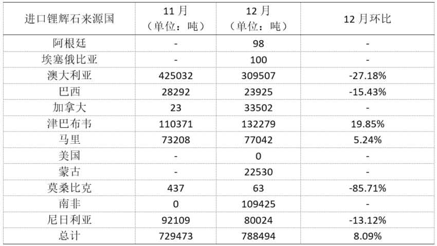 近期,2025年12月钴及锂电产业链相关产品进出口数据集中出炉,数据显示,2025年12月,锂辉石进口量级环比11月有所增加,达78.85万实物吨,折合碳酸锂当量(LCE)约7.85万吨。碳酸锂进口量方面,12月中国进口碳酸锂23989吨,环比增加9%,同比减少14%.......SMM整合了电池材料的进出口情况,具体如下: 上游 锂精矿 海关数据显示,2025年12月锂辉石进口量级环比11月有所增加,达78.85万实物吨,折合碳酸锂当量(LCE)约7.85万吨(SMM进行平均品位与含水量的拆分处理统计计算所得)。 从来源国看,加拿大来矿显著增长,达3.35万吨;津巴布韦来矿13.22万吨,环比增加19.85%;马里来矿12月到港7.70万吨,环比增加5.24%;受到11月来矿高位影响,12月来自澳大利亚的锂精矿进口量级有一定回落,达30.95万吨,环比减少27.18%;尼日利亚来矿同样有小幅下调,达8万吨,环比减少13.12%。 值得注意的是,12月我国首次从蒙古国进口锂矿,共2批次,达2.25万吨,进口单价均为169.52美元/吨。 另外,经SMM筛选分析,12月锂辉石精矿进口量约为62.8万吨,占比来矿总量80%,环比11月93%的占比有明显回落。