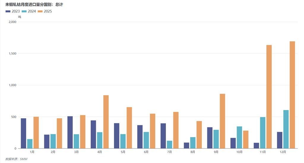 》【SMM分析】2025年12月中国钴湿法冶炼中间品进口量环比下降65% 未锻轧钴 2025年12月中国未锻轧钴进口量约为1691吨,环比上涨4%,同比上涨180%。12月进口量继续维持高位,主要因该时期中国电钴价格远高于海外,进口窗口打开,大量海外与保税区电钴流入国内。进口均价方面,2025年12月中国未锻轧钴进口均价为40454美元/吨,环比上涨14%。2025年全年累计进口9009吨,累计同比增加167%。