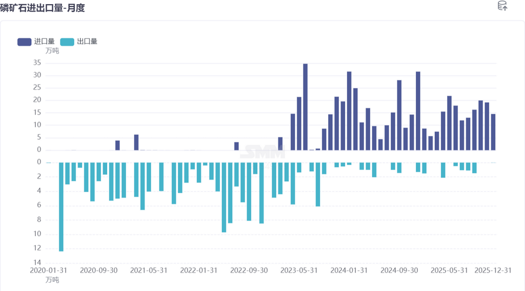 2025年12月,中国鳞片石墨出口量为6868吨,环比下滑16%,同比出现16%的增长。 进口端,鳞片石墨本土产量基本能满足下游需求,因此企业对进口鳞片石墨的采购需求大幅回落,直接导致进口量环比骤降43%,同时同比下降17%。 出口端,随气温逐渐走低,国内部分采矿企业已陆续进入停产,市场供应缩紧。在此背景下,国内厂商减少出口以保障本土市场需求,主动缩减出口配额,进而推动鳞片石墨出口量环比回落16%。不过,凭借中国在全球鳞片石墨市场的供应主导地位,叠加海外新能源领域对鳞片石墨的刚性需求支撑,2025年12月鳞片石墨出口量仍实现16%的同比增长。 》【SMM分析】12月中国鳞片石墨出口量环比回落同比增长 磷矿石 2025年12月,中国磷矿石进口总量环减24.2%至14.5万吨,进口总金额环减13.9%,全国综合进口均价环比上涨13.5%,均价上涨主要是因为湖北某磷化工企业进口6万吨秘鲁高价磷矿石,单价为121美元/吨。 2025年12月,中国磷矿石进口量从11月的19.2万吨环减到12月的14.5万吨,环减24.2%;进口金额从1653.7万美元环减1.5%至1423.5万美元。进口均价环比上涨13.5%,均价上涨主要是因为湖北某磷化工企业进口6万吨秘鲁高价磷矿石,单价为121美元/吨。埃及仍为最大进口国,占中国进口总量的50%,约旦占比4%。出口量从11月没有出口到12月出口200吨,主要是美国。