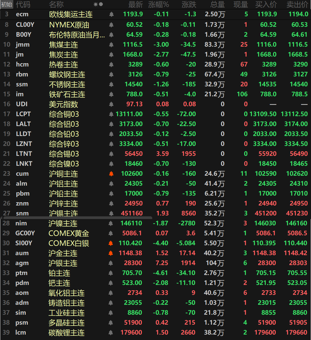 SMM 1月27日讯: 金属市场: 截至日间收盘,内盘基本金属普涨,仅沪锌和沪锡一同上涨,沪锡涨1.93%,沪锌涨0.77%,其余金属均下跌,沪镍跌1.87%领跌,其余金属跌幅均在1%以内。氧化铝主连涨0.33%,铸造铝主连跌0.22%。 此外,碳酸锂主连涨1.5%,多晶硅主连涨0.42%,工业硅主连跌0.78%。欧线集运主连跌0.11%报1193.9。 黑色系方面集体下跌,不锈钢跌1.26%,螺纹跌0.79%,其余金属均下跌,但跌幅波动不大。双焦方面,焦煤跌3%,焦炭跌2.77%。 外盘方面,截至15:04分,外盘基本金属除了伦锡外均下跌,伦锡涨3.59%,其余金属跌幅均在1%以内。 贵金属方面,截至15:04分,COMEX黄金涨0.07%,COMEX白银跌4.4%。国内方面,沪金涨1.52%,盘中最高冲至1154.46元/克,继续刷新其历史新高,沪银涨7.25%,盘中成功突破30000元/千克的整数关口,最高涨至30020元/千克,续刷历史记录! 此外,铂主连跌4.61%,钯主连跌2.08%。 截至今日15:04分行情