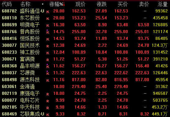 27日,沪指窄幅震荡,创业板指、科创50指数等走高;全A成交额缩至3万亿元下方;港股强势上扬,恒生指数涨超1%。 具体来看,沪指早盘一度下探,随后小幅震荡上扬;科创50指数较为强势。截至收盘,沪指涨0.18%报4139.9点,深证成指微涨0.09%,创业板指涨0.71%,科创50指数涨1.51%,沪深北三市合计成交约2.92万亿元,较此前一日缩量近3600亿元。 A股市场超3400股飘绿,煤炭、酿酒、石油、医药等板块走低;半导体板块大幅走高,盛科通信(688702)、东芯股份(688110)20%涨停,均创新高;普冉股份涨近15%,盘中亦创出新高;新型电池概念拉升,帝科股份涨超10%,金辰股份、宇晶股份等涨停;部分黄金概念股延续强势,白银有色斩获6连板,中国黄金、四川黄金等3连板;CPO概念活跃,源杰科技涨超11%突破800元大关,续创历史新高;天孚通信涨超7%。值得注意的是,紫金矿业盘中再度飙升,一度大涨8%续创历史新高,收盘涨2.8%,全日成交299.1亿元,位居A股成交额首位。 港股方面,中国人寿涨近6%,友邦保险涨逾4%,紫金黄金国际涨逾11%,紫金矿业涨近3%,创历史新高。 半导体板块爆发 半导体板块盘中大幅走高,截至收盘,盛科通信、东芯股份20%涨停,均创新高;普冉股份涨近15%,盘中亦创出新高;国民技术、晶丰明源、芯源微等涨超10%。