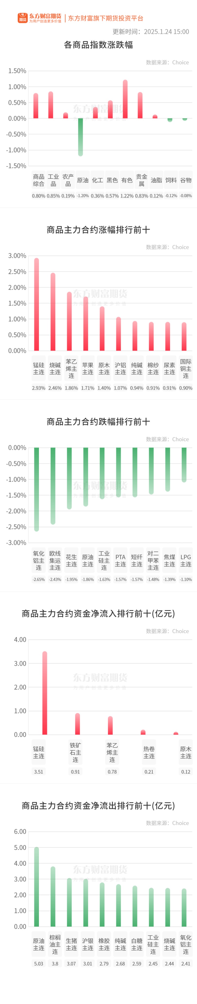 行情纵览![]() 宏观产经财联社:日本央行当地时间24日在货币政策会议上作出决定,将日本的货币政策利率从0.25%左右提升至0.5%左右。该利率也因此达到自2008年10月以来,时隔约17年,日本货币政策利率的最高水平。 证券时报网:当地时间周四,美国总统唐纳德·特朗普在瑞士达沃斯举行的世界经济论坛 (WEF) 年会上发表网络讲话时表示,已和中国国家领导人沟通,特朗普认为中美关系良好。值得一提的是,美国总统唐纳德·特朗普周五还表示,他“宁愿不对中国征收关税”。特朗普进一步指出,他认为可以与中国达成协议。在特朗普关于关税的表态之后,恒生科技指数涨幅扩大至3%,恒指涨超2%。此外,离岸人民币对美元持续拉升,逼近7.25关口,现涨0.5%。 品种资讯黑色系期货 铁矿石:据上海钢联(Mysteel),截至1月24日当周,全国样本生铁企业64座高炉中有36座停产检修,检修高炉容积合计8823m³,周度产能利用率为53.1%,周环比下降1.44个百分点。厂内生铁库存32.73万吨,周环比减少4.18万吨。(Mysteel) 焦炭:本周焦企焦炭库存43.1万吨,环比+1.4万吨,+3.4%。钢厂焦炭库存303.2万吨,环比+0.5万吨,+0.2%。焦企焦煤库存319.1万吨,环比+0.1万吨,+0.0%。港口焦炭库存118万吨,环比-6.3万吨,-8.0%。(上海有色网) 农产品期货 棕榈油:据马来西亚棕榈油协会(MPOA)发布的数据,马来西亚1月1-20日棕榈油产量预估减少13.29%,其中马来半岛减少15.57%,沙巴减少10%,沙捞越减少11.27%,马来东部减少10.37%。(新华财经) 生猪:据农业农村部监测,截至1月24日14:00时,全国农产品批发市场猪肉平均价格为22.95元/公斤,较前一日上升0.4%;鸡蛋平均价格为9.85元/公斤,较前一日下降0.7%。 据上海钢联重点养殖企业样本数据显示,2025年1月24日重点养殖企业全国生猪日度出栏量为259341头,较前一日下调17.67%。(新华财经) 棉花:2025年1月24日中国棉花价格指数(CCIndex)至14707元/吨,较上个交易日下跌107元/吨。(中国棉花信息网) 有色/贵金属期货 沪铝:2025年1月份(31天)国内电解铝产量同比增长3.8%,环比下滑0.3%。1月国内电解铝运行产能环比大稳小动,仅山西地区个别铝厂传来减产2万吨/年的消息,其余早前减产产能暂无复产消息。月内多地地区铸锭比例增加,行业铝水比例环比下降2.9个百分点,同比下滑1.0%。根据SMM铝水比例数据测算,12月份国内电解铝铸锭量同比增加7.3%至113万吨附近。(上海有色网) 沪铜:日内主流平水铜对当月合约报贴水80元/吨-贴水60元/吨,好铜报贴水60元/吨-贴水40元/吨。日内升水继续下行,市场零星报盘多以回款为目的,实际成交偏弱。下周至节前仅1个交易日,预计现货升水将企稳运行。(上海有色网) 沪金:1月24日,记者从中国黄金协会获悉,2024年,我国黄金消费量985.31吨,同比下降9.58%。其中,黄金首饰532.02吨,同比下降24.69%;金条及金币373.13吨,同比增长24.54%;工业及其他用金80.16吨,同比下降4.12%。(中国证券网) 能化期货 PVC:截至1月23日,PVC社会库存新样本环比增加0.17%至75.26万吨,同比增加20.86%;其中华东地区在71.96万吨,环比减少0.10%,同比增加28.53%;华南地区在3.3万吨,环比增加6.45%,同比减少47.45%。(隆众资讯) 烧碱:今日山东省内液碱整体库存依旧不高,但随着新年的到来,部分液氯下游需求不佳,液氯走货显疲软,已经有减产企业出现,重点关注近期送货量的变化以及主力下游采购价格的调整。鲁西南32%离子膜碱主流成交970-990;鲁中东部32%离子膜碱主流成交950-1000,50%离子膜碱主流成交1580-1620;鲁北地区32%离子膜碱主流成交983-1040;鲁南32%离子膜碱主流成交990-1000。(单位:元/吨)(隆众资讯) 晚间关注无 (文章来源:东方财富研究中心) |