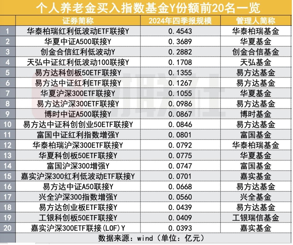 财联社2月5日讯(记者闫军)指数产品在个人养老金上持续吸金,尽管指数基金Y份额纳入个人养老金仅12个交易日,吸金已超过3亿元。 去年12月15日,个人养老金试点推向全国,产品也迎来扩容,其中,首批85只权益类指数基金纳入。尽管中间有基金公司与银行对接系统的时间,指数Y份额实际可买时间或不足10个交易日,其中,7只产品规模超千万,华泰柏瑞红利低波动ETF联接Y获得最多买入,达到4543万元。 从公司角度来看,华夏基金拔得头筹,旗下指数Y份额合计流入6718万元,易方达基金和华泰柏瑞基金紧随其后,分别获得6293万元和5693万元的买入。 个人养老金爱买什么?红利当先 随着基金四季报的披露,去年12月15日扩容的首批85只权益类指数基金Y份额规模浮出水面。不完全统计显示,有统计数据的68只产品合计获得3.164亿元买入。(注:当年四季度成立的中证A500指数相关产品未披露数据) 具体来看,华泰柏瑞红利低波动ETF联接Y买入最多,为4543万元;华夏中证A500联接Y买入3689万元,创金合信红利低波Y买入2882万元。此外,天弘中证红利低波动100联接Y、易方达科创板50ETF联接Y、易方达中证红利ETF联接Y和华夏沪深300ETF联接Y等4只产品买入超千万。 从产品类型上来看,投资者最为青睐的产品是红利主题。以个人养老金买入前20的指数基金Y份额来看,其中有红利主题产品多达6只,6只产品合计规模达到1.2亿,在全部指数Y份额中占比近38%。 ![]() 在业内看来,这一方面与红利产品较好表现相关。华泰柏瑞此前曾在推文中指出,红利低波策略之所以能够走出独立行情,是市场进入了更适配红利低波策略的新阶段。 2021年来,“低利率+低增速+市场风险偏好低迷”成为A股市场主旋律,无论是10年、30年期国债收益率,还是我国GDP同比增速均步入下行通道,具备“高股息、低波动”的红利低波策略天然更容易获得稳健资金青睐。 另一方面,也符合个人养老金等中长期资金的风格偏好。红利成份股具有相对盈利与业绩稳定性的红利低波策略长期趋势确定性较高,这与追求长期稳健回报的资金或更为契合,因此或适合作为权益组合的底仓资产低吸长持。 不过,也需要提醒投资者的是,作为权益投资策略,不能脱离市场整体表现看待红利低波策略,避免追高与过度交易。 强者恒强,华夏、易方达和华泰柏瑞居前三 公司维度来看,指数基金在Y份额上依然是强者恒强:一是获得个人养老金买入Y份额前十的公司合计规模达到2.93亿元,占比高达92%;二是入选指数产品越多,Y份额被买入越多,以华夏、易方达等头部为代表;三是受益于红利策略指数Y份额被较多买入,公司排名也能靠前,例如华泰柏瑞和创金合信。 首先来看,获得个人养老金买入指数基金Y份额前三的公司是:华夏基金、易方达基金和华泰柏瑞基金,三巨头分别被买入6718万元、6293万元和5693万元。 在此次扩容的85只指数基金中,易方达和华夏入选产品最多,分别达9只和8只,两家获得买入金额仅相差不足500万元。 ![]() 有意思的是,个人养老金合计买入最多的前三家基金公司也是去年四季度非货ETF规模的前三名。可以说,指数基金马太效应再一次强化。 ![]() 华泰柏瑞在Y份额上脱颖而出,在于以红利取胜,其入选产品有4只,其中华泰柏瑞红利低波动ETF联接Y吸金超4500万元。此外,仅有一只红利低波策略产品入选的创金合信,因在招商银行渠道较多曝光获得投资者青睐,在基金公司合计规模中排名第四。 199只养老FOF基金Y份额最新规模达88亿 首批养老FOF基金Y份额表现情况如何? Wind数据显示,截至2024年四季度末,199只养老FOF的Y份额在当季度获得14.88亿元的买入,最新合计规模达到88.27亿元,规模与份额环比增幅均超20%。一般而言,年底是个人养老金缴费的高峰,每人每年1.2万元的额度,在全国扩容的背景之下,20%的增幅并不算高。 其中原因也不言而喻,首批养老FOF基金Y份额成立以来,A股市场跌多涨少,权益市场不给力拖累了FOF基金的表现。加之FOF配置工具并不多,不能有效对冲市场跌幅,最先买入的投资者在相当长的一段时间内处于亏损状态,影响了投资者的信心。随着个人养老金产品的扩容,指数产品一定程度上分流。 尽管2024年924行情以来,亦有不少FOF基金抓住了机会,实现了净值翻身,FOF基金今年仍然迎来了一波出清,财联社此前统计显示,2024年共有16只养老FOF清盘,其中就包括鹏华长乐稳健养老一年Y、创金合信添福平衡养老目标三年持有Y2只产品均随着主基金清盘。 春节前,六部委印发《关于推动中长期资金入市工作的实施方案》,这份中长期资金入市“施工图”着力为公募基金、商业保险资金、养老金等中长期资金入市扫清障碍,在业内看来,随着监管践行以投资者为本的理念,进一步加大政策供给,努力营造更加有利于长期投资、价值投资、理性投资的市场生态,未来个人养老金增配权益市场空间将更为广阔。 |