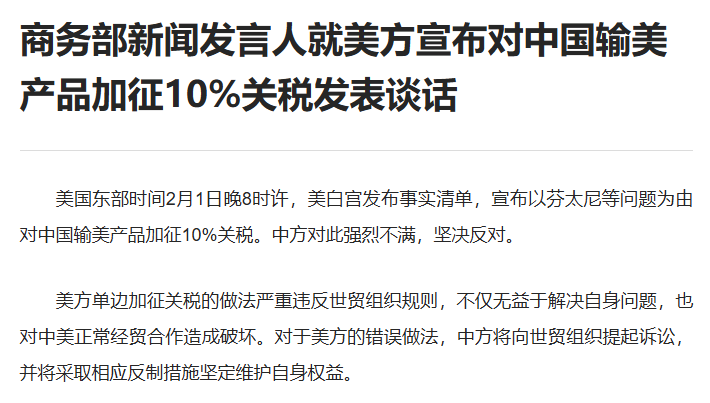 专家:贸易战中没有赢家 事实上,在我国正式宣布对美部分产品加征关税前,商务部发言人就曾明确中国会采取相应措施来应对。“面对美方的错误做法,我国将向世贸组织提起诉讼,并将采取相应反制措施坚定维护自身权益。”商务部新闻发言人2月2日对外表示。2月5日,商务部新闻发言人对外表示,中方为捍卫自身合法权益,已将美征税措施诉至世贸组织争端解决机制。 ![]() 图片来源:商务部官网 “美国通过对中国商品加征关税、要求中国扩大进口美国农产品、能源产品等方式,能促使中国改变贸易结构,让美国在贸易关系中占据更有利位置,实现贸易平衡,从而振兴美国国内相关产业,增加就业岗位。”乘联分会秘书长崔东树表示。 纪雪洪也表示,美国对包括中国在内的一些国家的进口产品加征关税,短期内将提高美国消费者的购买成本,但长期来看,其主要目的是为了让美国制造业回流,提高美国就业和汽车产业的发展能力。“事实上,从更长期来看,自由贸易才是对各国发展最有利的方式。”纪雪洪表示。 据新华社消息,除对中国进口产品加征关税外,美国还将对进口自墨西哥、加拿大两国的商品加征25%的关税,其中对加拿大能源产品的加税幅度为10%。 “在贸易战中,没有赢家。国家之间应该以相对和平的方式来解决问题,否则最后吃亏的还是消费者。”崔东树对记者表示。 (文章来源:每日经济新闻) |