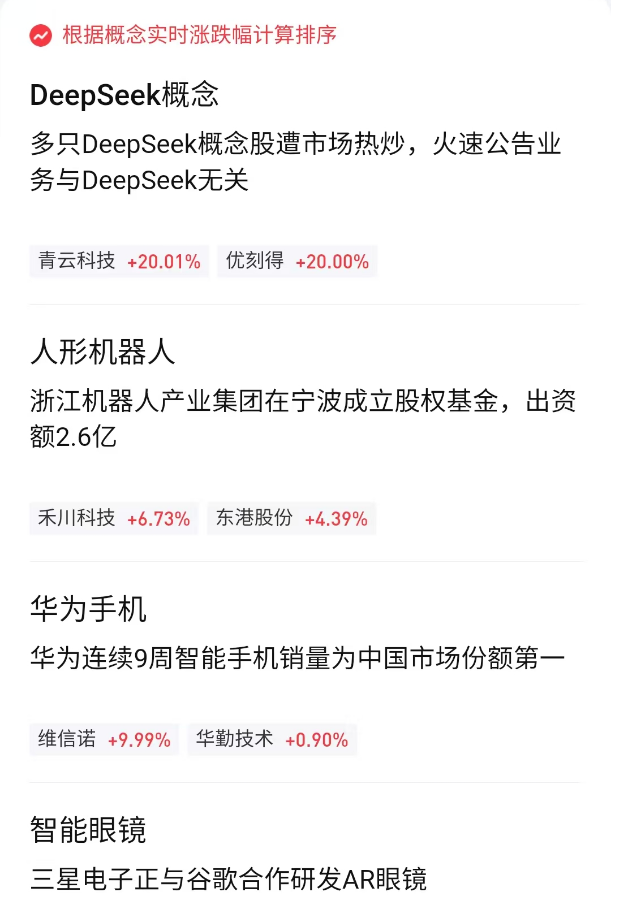 图片来自:网络 另外,目前券商研究所的各类研报和电话会也是密切聚焦AI。与科技相关的各行业分析师几乎是言必称DeepSeek。事实上,DeepSeek引爆的科技行情已经从AI软件蔓延到智能手机、智能眼镜、智能驾驶等硬件应用领域。例如,今天在比亚迪将召开智能化战略发布会的催化下,智驾概念股异动大涨,比亚迪午后强势涨停。 而这种外溢效应还在不断蔓延到其他领域,每经记者注意到,DeepSeek的火出圈激发了一些看似和科技行业关系不算直接的行业分析师的挖掘热情。 例如,华福证券商社团队今晚举办“AI如何赋能消费”的AI应用专题会议,此次会议将探讨大模型与消费应用结合的案例(消费场景、电商应用、零售赋能及其他消费应用领域)。 据悉,今晚,华泰证券将举行“周期半月谈第10期:关税迷雾和Deepseek惊喜”电话会,参会的主讲人为首席宏观经济学家、有色、化工、能源、建筑建材、农林牧渔首席等非科技行业分析师。