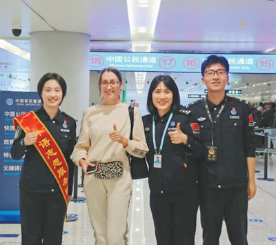 外国游客在杭州萧山国际机场国际服务中心,为便捷的入境服务“点赞”。 李玎摄