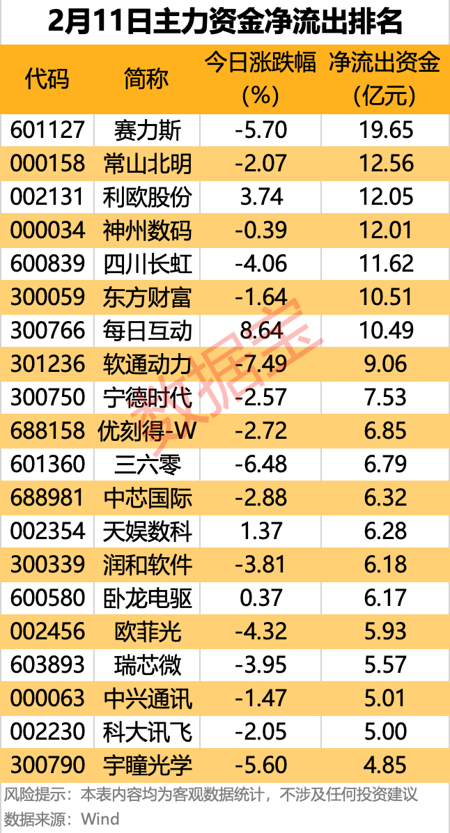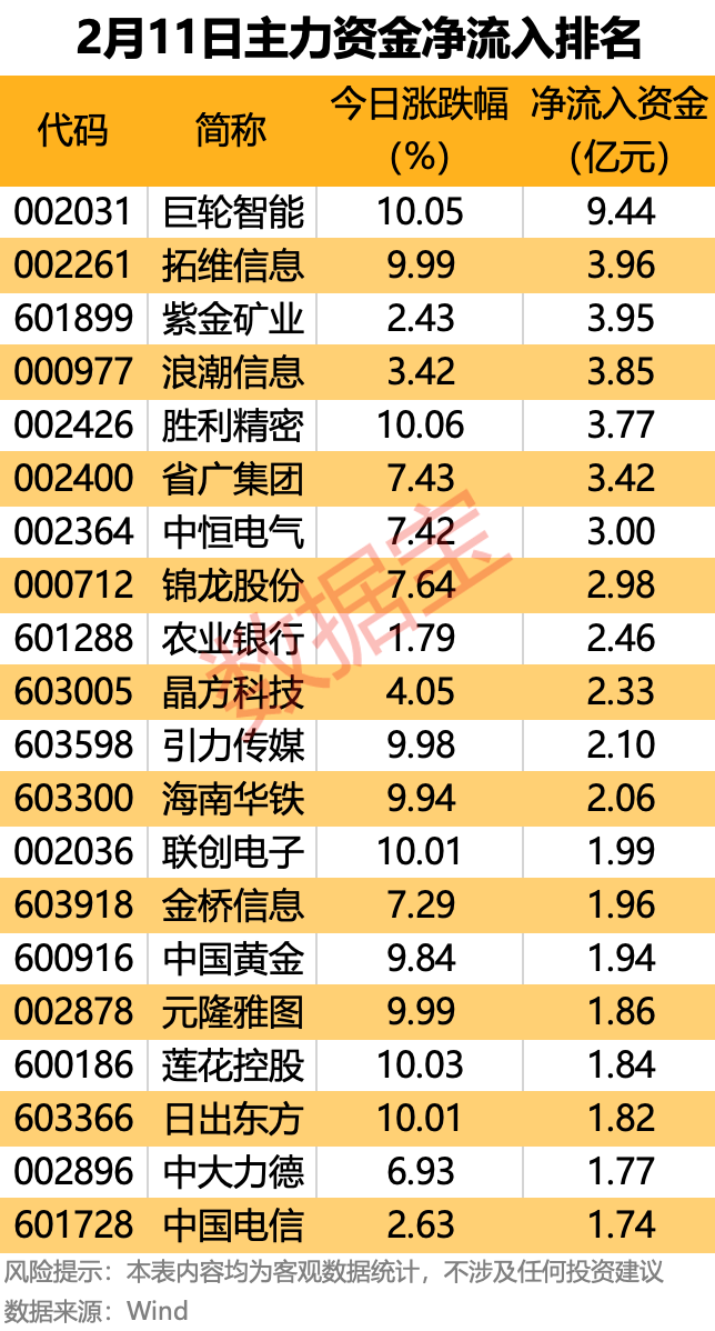 今日仅2个行业主力资金净流入。 据证券时报·数据宝统计,今日沪深两市主力资金净流出584.2亿元,其中创业板净流出224.41亿元,沪深300成份股净流出139.03亿元。 行业板块方面,申万一级行业中,10个行业上涨,纺织服饰涨幅居首,为1.31%;还有银行、传媒、石油石化和基础化工等行业跟涨。20个下跌行业中,房地产行业跌幅居首,为1.67%;还有电力设备、国防军工、计算机和医药生物等行业跌幅在1%以上。 从资金流向来看,仅2个行业主力资金净流入,纺织服饰行业净流入居首,达1.57亿元;银行行业居次席,为5343.78万元。 29个主力资金净流出的行业中,计算机行业净流出金额居首,达172.3亿元;电子、汽车、医药生物、电力设备等行业净流出金额均超30亿元。 7股遭大幅净流出 从个股来看,今日共有50股主力资金净流入超1亿元,其中12股净流入均超2亿元。 巨轮智能主力资金净流入金额居首,达9.44亿元。该股今日涨停,报收8.32元/股,换手率22.14%,成交额35.47亿元。公司2024年业绩预计亏损扩大,2024年归母净利润为-1.2亿元至-1.8亿元;预计2024年归母扣非净利润为-1.24亿元至-1.85亿元。 1月27日有投资者向巨轮智能提问:“公司一直亏本会不会被ST?”对此,巨轮智能2月10日在投资者互动平台回答称:“根据《深圳证券交易所股票上市规则(2024年修订)》的相关规定,公司目前不存在您所说的情况。” 拓维信息一字涨停,主力资金净流入3.96亿元,居次席。作为算力概念股,拓维信息受益于近期的DeepSeek行情热潮。 国产AI大模型DeepSeek宣布结束其DeepSeek-V3 API服务的优惠体验期,并自2月9日起调整为新的收费标准。这一变动表明DeepSeek正在逐步走向商业化,同时也反映了市场对AI算力需求的增长。 紫金矿业主力资金净流入3.95亿元。盘面上,有色板块涨势明显,其中黄金、铜方向表现出色。莱绅通灵、菜百股份已涨停,北方铜业盘中涨停。 消息面上,国际金价突破2900美元大关,再创历史新高,最高触及2940美元/盎司上方;COMEX黄金期货价格也同步走高,一度站上2950美元/盎司上方。