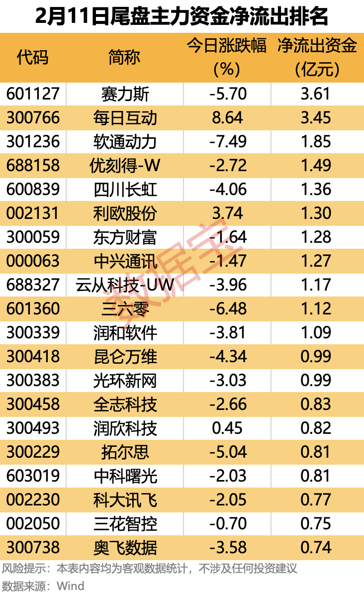 据数据宝统计,40股尾盘主力资金净流出超5000万元,其中11股尾盘净流出金额超1亿元,赛力斯和每日互动尾盘主力资金净流出均超3亿元。 DeepSeek概念股每日互动今日涨8.64%,龙虎榜数据显示,上榜营业部席位全天成交10.62亿元,占当日总成交金额比例为11.21%。其中,买入金额为4.03亿元,卖出金额为6.59亿元,合计净卖出2.56亿元。 具体来看,东方财富证券拉萨团结路第一证券营业部、东方财富证券拉萨团结路第二证券营业部分别买入8426.30万元、7154.73万元;中国银河证券北京学院南路证券营业部、联储证券重庆江北嘴证券营业部分别卖出1.43亿元、9359.27万元。