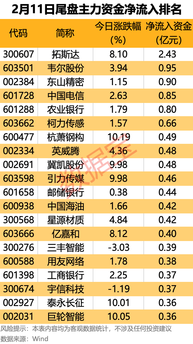 尾盘主力资金加仓股出炉 据数据宝统计,尾盘两市主力资金净流出65.72亿元,其中创业板尾盘净流出31.66亿元,沪深300成份股尾盘净流出10.94亿元。 从个股来看,13股尾盘主力资金净流入金额超4000万元,其中6股金额超5000万元。 机器人概念股拓斯达尾盘主力资金净流入居首,达2.43亿元。盘面上,机器人板块尾盘获资金回流,冀凯股份尾盘涨停,亿嘉和、长盛轴承、拓斯达、兆威机电集体翘尾。 此外,韦尔股份、东山精密、中国电信、农业银行、柯力传感等尾盘净流入金额也居前。