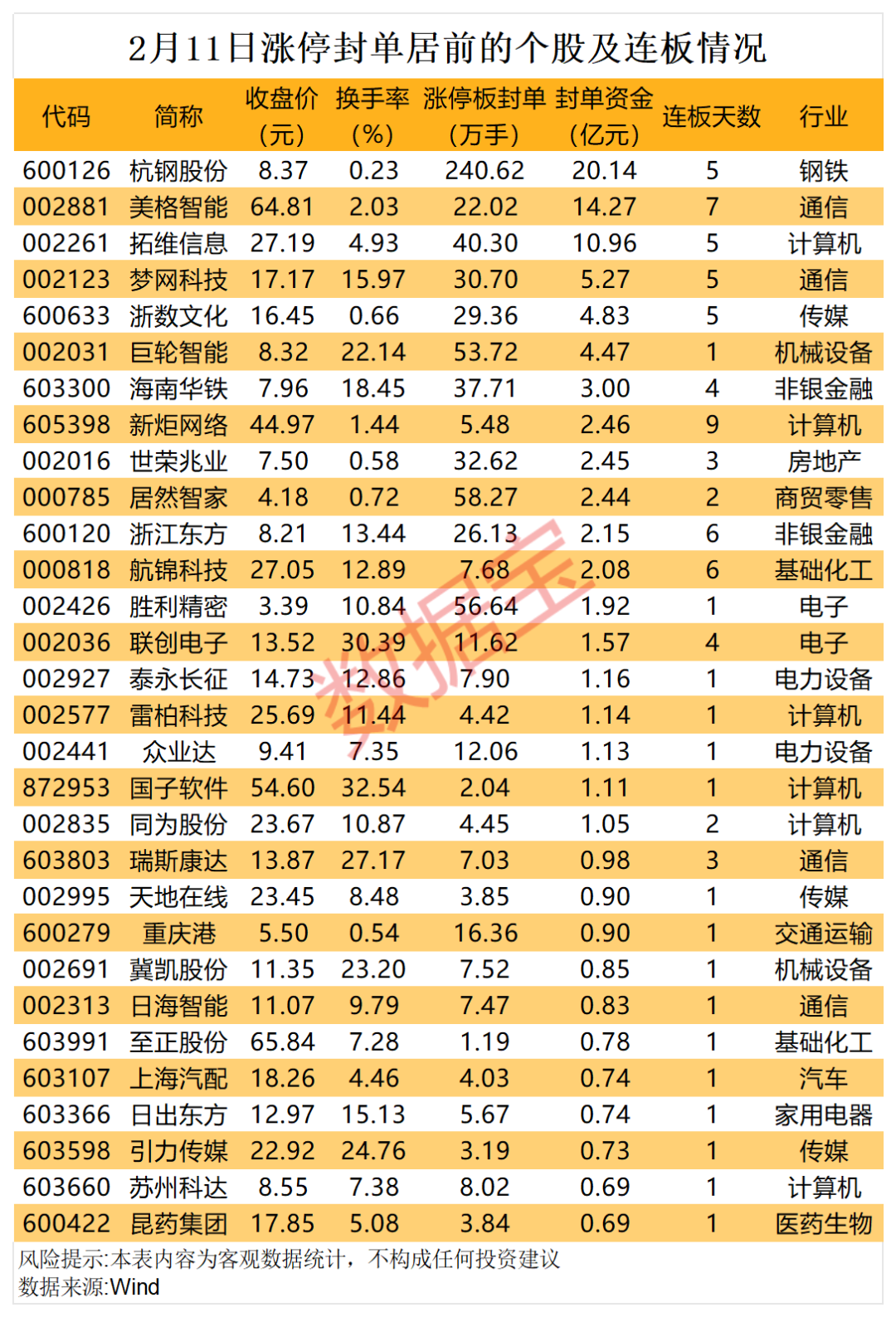 2月11日,A股市场收盘共84股涨停(其中包含11只ST股);另外有33股封板未遂,整体封板率为71%。 涨停战场:超240万手买单抢筹杭钢股份 据证券时报·数据宝统计,从收盘涨停板封单量来看,DeepSeek概念股杭钢股份封单量最高,达240.62万手;其次是居然智家、胜利精密,涨停板封单分别为 58.27 万手、 56.64 万手。 以封单金额计算,19股封单金额超1亿元,其中杭钢股份、美格智能、拓维信息封单金额居前,分别为 20.14 亿元、 14.27 亿元、 10.96 亿元。 从连续涨停天数来看,新炬网络9连板,美格智能7连板,浙江东方、航锦科技6连板,杭钢股份、拓维信息、梦网科技、浙数文化、青云科技-U均5连板,海南华铁、联创电子、*ST龙津均4连板,世荣兆业、瑞斯康达、奥瑞德、*ST工智均3连板,居然智家、同为股份、金帝股份等11股2连板。 另外,*ST信通15日14板,创兴资源、光线传媒、*ST中润均5日3板,*ST富润4日3板。