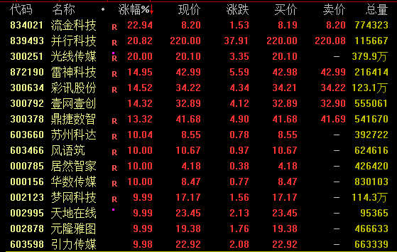 近日,招商银行、中信银行、兴业银行、浦发银行、杭州银行、齐鲁银行、宁波银行等陆续发布2024年业绩快报。截至目前,已有13家上市银行披露2024年业绩快报,其中10家银行实现营收增长,12家银行归母净利润实现增长,浦发银行、杭州银行等5家银行净利润同比双位数增长。 湘财证券指出,随着金融配合财政政策发力,财政资金加快落实到项目建设,小微企业融资协调工作机制加强发挥作用,有望促进银行贷款稳健增长。同时,房地产与城投资产质量将在房地产政策与化债政策支持下趋于改善,有望加强银行经营业绩稳健性。建议关注两条主线:一、随着积极政策推进,在经济修复过程中,优质区域行经营业绩弹性更足,有望提供较高动态股息率,而股份制银行资产内在价值修复空间扩大,高股息优势也有望加强;二、国有大型银行股,高股息价值仍然显著。 AI应用概念活跃 AI应用概念盘中走势活跃,截至收盘,光线传媒20%涨停,雷神科技、彩讯股份、壹网壹创涨超14%,梦网科技、天地在线、元隆雅图、引力传媒等近10股亦涨停。