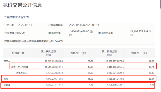 在传媒娱乐股集体大涨之际,多只相关的ETF也暴涨。 光线传媒昨晚发布股票交易异常波动暨严重异常波动的公告称,公司股票交易连续5个交易日内(2025年2月5日至2025年2月11日)收盘价格涨幅偏离值累计超过100%,根据深圳证券交易所的有关规定,属于股票交易严重异常波动的情形。 上述公告称,公司及子公司出品、发行的影片《哪吒之魔童闹海》(或称《哪吒2》)已于2025年1月29日起在中国大陆地区公映,目前正在热映中。根据深圳证券交易所相关要求,公司已于2025年2月5日在符合条件的创业板信息披露网站上披露了《关于电影票房的公告》。光线传媒还称,公司前期披露的信息不存在需要更正、补充之处。公司未发现近期公共传媒报道可能或已经对本公司股票交易价格产生较大影响的未公开重大信息。近期公司经营情况正常,内外部经营环境未发生重大变化。另外,经核查,公司、控股股东和实际控制人不存在关于本公司的应披露而未披露的重大事项,也不存在处于筹划阶段的重大事项。经核查,公司控股股东、实际控制人在股票异常波动暨严重异常波动期间不存在买卖公司股票行为。 深交所2月11日披露的竞价交易公开信息显示,在2025年2月5日至2025年2月11日股价严重异常波动期间,光线传媒中小投资者累计买入占比47.18%,累计卖出占比38.71%;相较之下,上述时间区间内,机构累计买入占比16.98%,累计卖出占比28.84%。