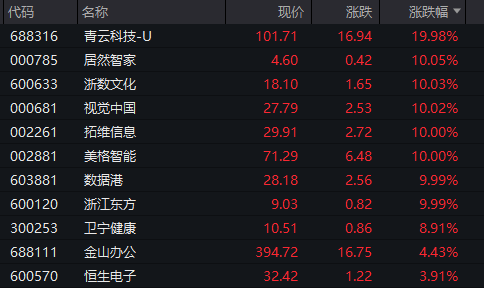 据光线传媒此前公告,截至2025年2月4日,公司来源于该影片的营业收入区间约为人民币9.50亿元至人民币10.10亿元(最终结算数据可能存在误差)。彼时,《哪吒2》累计票房收入(含服务费)约为人民币48.40亿元(最终结算数据可能存在误差)。 据灯塔专业版数据,截至发稿,《哪吒2》累计票房已突破92亿元,进入全球影史票房榜TOP25,目前排名第24,在全球动画电影票房榜中排名第5。 此外,灯塔专业版最新的AI预测显示,《哪吒2》总票房有望超过150亿元。如若达到这一票房,《哪吒2》将排在全球动画电影票房榜首,也将进入全球影视票房榜前十。 除了传媒娱乐板块外,软件服务、互联网、元器件、矿物制品、酒店餐饮等板块也涨幅居前。有色、交通设施、煤炭等板块表现疲弱。 DeepSeek概念股继续上行 DeepSeek概念股继续上行,青云科技-U、浙数文化、视觉中国等多只股票盘中继续涨停。