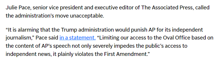 △美联社执行主编朱莉·佩斯作出回应 美联社高级副总裁、执行主编朱莉·佩斯表示,特朗普政府因美联社的独立新闻而惩罚美联社,这令人担忧。朱莉·佩斯说,“政府基于美联社的新闻报道而禁止其进入总统办公室的做法,不仅严重阻碍公众获得独立新闻报道的权利,并且明显违反美国宪法第一修正案。 ” 另据美国有线电视新闻网(CNN)报道,白宫方面暂未对此事进行回应。不过,白宫记者协会称,白宫的行为“不可接受” 。