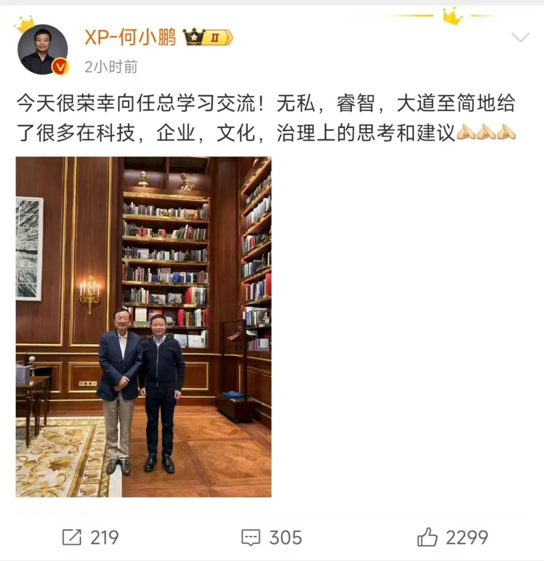 从左至右依次为张俊杰、王兴兴、李大海、袁进辉、任正非、何小鹏、徐新等 2月12日当天,何小鹏发微博表示:“今天很荣幸向任总学习交流!无私,睿智,大道至简地给了很多在科技,企业,文化,治理上的思考和建议。”并配上了一张他与任正非的单独合照。