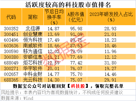 科技牛氛围浓厚。 近期A股市场在DeepSeek题材的带领下,走出了一波持续反弹行情,两大科创指数今天均创出年内新高。科技牛氛围浓厚,计算机、传媒两大指数节后均飙升超10%;概念指数涨势更凶猛,DeepSeek、智谱AI、云计算等多个科技概念涨超20%。 财信证券表示,全球科技革命背景下,中国科技自立步伐加快,科技成长将成为2025年及更长时期的市场主线。哪类股票能跑赢市场?以互联网+牛市为例,小市值的高科技股票明显走强。 高度活跃的低市值高科技股曝光 一批活跃度较高的高科技低市值股票值得关注。据证券时报·数据宝统计,A股市值在100亿元以下、2023年研发支出超1亿元且占比超10%且节后日均换手率超10%的TMT板块个股,合计共有32只个股。