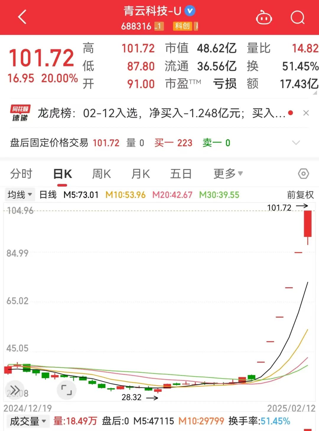 青云科技-U发布股东减持公告,此前6连20cm涨停。 昨日晚间,青云科技-U发布公告,公司持股5%以上股东及其一致行动人于2月6日—2月11日通过集中竞价、大宗交易的方式,合计减持公司62.13万股股份,占公司总股本的1.3%,按最新收盘价计算,对应6319.98万元。 值得注意的是,青云科技-U自2月5日开始连续6个交易日涨停,累计上涨198.56%,节后累计涨幅在全部A股中居首,高于并行科技、光线传媒、每日互动等热门股。2月5日—2月11日,青云科技-U均为一字涨停,2月12日开盘后出现开板,午后继续封死涨停,最新收盘价101.72元/股,成为新晋百元股。