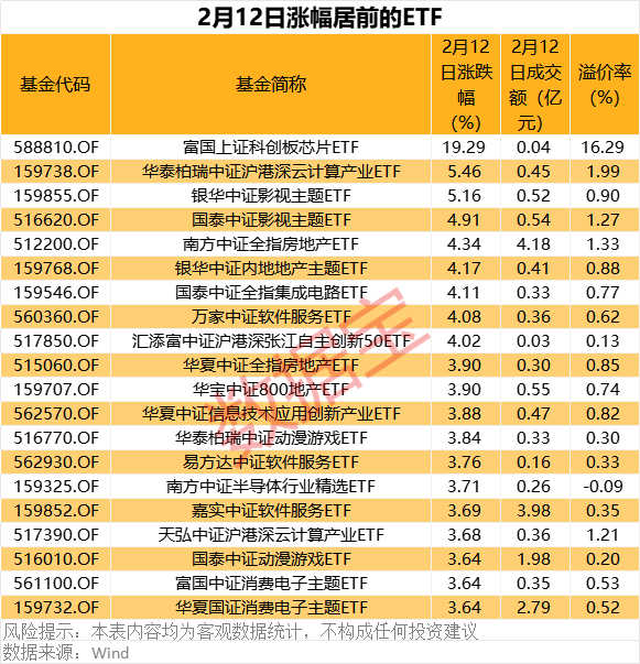 盘后数据显示,2月5日—12日期间,青云科技-U主要获自然人净买入、机构净卖出,其中中小投资者净买入2322.31万元,其他自然人净买入1.29亿元,机构净卖出1.52亿元。 青云科技-U昨日晚间还发布了股票交易异常波动暨严重异常波动公告,公司提示,公司自上市以来持续亏损,根据《2024年年度业绩预告公告》预计公司2024年度依然亏损,当前股价存在非理性炒作风险以及回调的可能,交易风险较大,敬请投资者注意二级市场交易风险,理性决策,审慎投资。 对于近期热门的DeepSeek概念,公司回应,DeepSeek系开源大语言模型,任何用户皆可免费基于该模型开展训练工作,公司旗下部分产品也进行了DeepSeek的接入,但公司未与DeepSeek签署服务合作协议,与其没有业务合作,该事项对当前主营业务开展无实质影响,请广大投资者审慎决策、理性投资。 截至2月12日收盘,A股市场已有7股节后累计涨幅超过100%,即最新收盘价较春节前收盘价实现翻倍,其中包括青云科技-U、并行科技、每日互动等DeepSeek概念股,以及主投、发行《哪吒2》的光线传媒。 富国上证科创板芯片ETF尾盘5分钟拉升超15% 2月12日,富国上证科创板芯片ETF出现罕见跳涨,尾盘5分钟涨幅由2.72%扩大至收盘的19.29%,振幅超16%,全天成交额366.18万元,截至收盘,该ETF溢价率达到16.29%,估算规模不到5000万元。 富国上证科创板芯片ETF跟踪标的为上证科创板芯片指数,该ETF于今年1月9日上市,在相同标的ETF中上市日期时间最短,基金规模亦最小。2月12日,跟踪上证科创板芯片指数的其他5只ETF上涨幅度在1.9%—2.7%之间不等,仅富国上证科创板芯片ETF尾盘出现跳涨现象。 昨日A股市场午后持续拉升,带动ETF市场集体走高,多只主题ETF大涨,其中银华中证影视主题ETF、华泰柏瑞中证沪港深云计算产业ETF涨幅超过5%,国泰中证影视主题ETF、南方中证全指房地产ETF、银华中证内地地产主题ETF等6只ETF上涨4%以上。