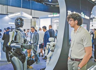 在第四十四届海湾信息和通信技术展上,观众参观中企展示的机器人。 中东中心分社塔里克·易卜拉欣摄