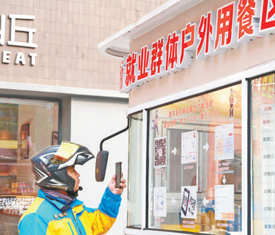 外卖员在北京市东城区某商区“骑手友好移动餐车”用手机扫码点餐。 郭俊锋摄(人民视觉)