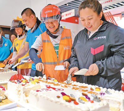 河北秦皇岛市海港区,快递员、外卖员在骑手驿站里享用蛋糕。 曹建雄摄(人民视觉)
