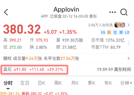 美股AI应用两大牛股齐创历史新高。 近期美股AI硬件股的走势竟然远远不如AI软件股。披露2024年四季度业绩后,美股AI应用股AppLovin(爱普拉维)的股价在盘后飙涨超29%至491.8美元,历史新高在望,2022年底该股收盘价只有10.53美元,据此计算AppLovin两年多时间暴涨4570%,远超英伟达同期涨幅,后者累计涨幅8倍左右。 在AppLovin的示范下,今天早盘A股相关概念股也大幅上涨。易点天下、蓝色光标等多只个股涨幅居前。 AI超级牛股盘后飙升 AppLovin周三盘后公布财报显示,第四季度业绩以及下一季度业绩指引均超出华尔街营收预期,刺激股价大涨超29%。具体来看,公司第四季度广告收入猛增73%,达到近10亿美元。AppLovin表示,其AI模型的改进仍处于早期阶段,未来将实现更个性化的广告投放。 据悉,AppLovin主要是一个广告中间商的角色,帮助大量的尾部互联网APP,把用户流量时长变现,把广告位放到Applovin的平台上,而同时,Applovin将这些APP背后的用户人群标签并分类,将这些广告位整理好提供给广告主,包括但不限于消费品公司、医药公司、其他互联网软件公司。公司推出的AXON AI广告引擎,能够通过自我学习不断优化,更高效地实现广告精准投放,尤其是在大规模广告拍卖与需求供应匹配方面优势明显。 该股已经连续3年大涨,2023年涨超278%,2024年涨近713%,2025年迄今涨超17%。算上盘后的大涨,AppLovin的股价已然创出历史新高。以491.8美元计算,2022年底AppLovin收盘价只有10.53美元,两年多时间该股暴涨4570%,按照7.3的汇率大致计算市值超过1.2万亿元。