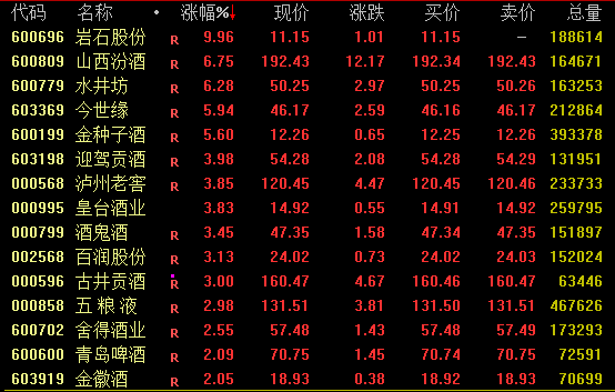 据灯塔专业版实时数据,截至发稿,影片《哪吒之魔童闹海》票房突破97亿元。 另据灯塔专业版全球票房榜,截至2月13日,影片《哪吒之魔童闹海》总票房(含预售)突破13.49亿美元,超过《黑豹》进入全球影史票房榜前18名。 机构表示,随着市场逐步回暖,观众重燃观影热情,新一年的电影市场将有望重新迎来繁荣。看好影视板块的复苏以及国潮动漫持续火热催化下的IP谷子经济。 平安证券指出,行业供给端逐渐恢复,影片数量呈较好的增长趋势,经过不断的修复与调整,头部公司业绩逐渐修复。政策端的持续加持及国家对文娱消费的鼓励,将助力影视院线行业景气向上。加之,影视院线行业估值性价比较高,看好头部院线及制作头部企业业绩稳健恢复。 白酒股拉升 酒类股今日强势拉升,截至收盘,山西汾酒、水井坊涨超6%,今世缘、金种子酒涨超5%,迎驾贡酒、泸州老窖涨近4%,五粮液涨约3%。
