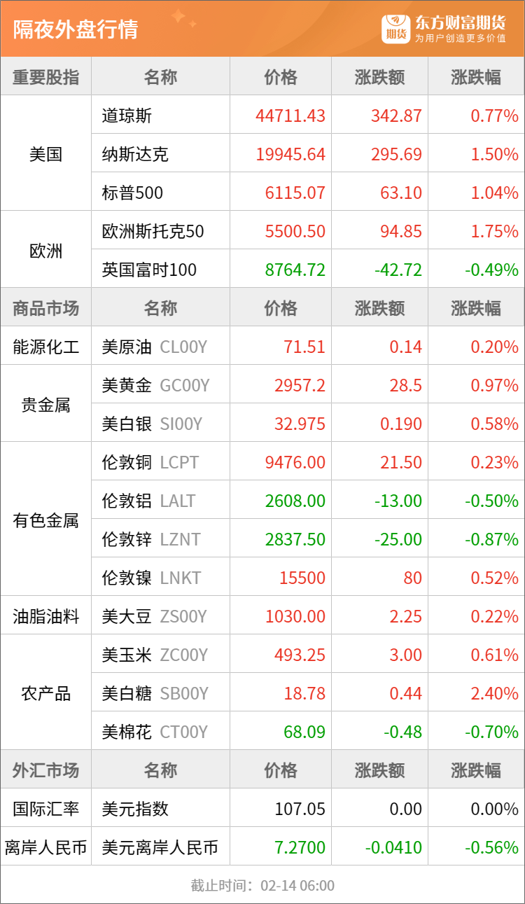 隔夜行情![]() ![]() 每日精选央行:择机调整优化政策力度和节奏 保持流动性充裕 全球石油要吃紧?IEA过剩预估腰斩 美俄伊博弈加剧 俄罗斯股市暴涨!特朗普突然宣布!俄乌冲突正处于重大转折点 宏观产经央行:发布2024年第四季度中国货币政策执行报告。报告表示,实施好适度宽松的货币政策。综合运用多种货币政策工具,根据国内外经济金融形势和金融市场运行情况,择机调整优化政策力度和节奏,保持流动性充裕,使社会融资规模、货币供应量增长同经济增长、价格总水平预期目标相匹配。 央视新闻:当地时间2月13日,美国总统特朗普宣布,他已决定征收“对等关税”,即让美国与贸易伙伴彼此征收的关税税率相等,并称将考虑对使用增值税制度的国家加征关税。特朗普当天在白宫椭圆形办公室签署备忘录时说,“为了公平起见,我决定征收对等关税,这意味着无论其他国家向美国征收多少关税,我们也将向他们征收相同的关税,不多不少”。 证券时报网:2月13日俄罗斯股市开盘后,主要指数全线大涨。市场分析人士认为,俄乌冲突的缓和预期是欧洲市场大涨的主要驱动力。美国东部时间2月12日,美国总统特朗普先后与俄罗斯总统普京、乌克兰总统泽连斯基通电话。在与普京交谈后,特朗普在社交平台上发帖称,两人同意让各自的团队立即开始磋商。种种迹象表明,俄乌冲突正处于重大转折点。 品种资讯黑色系期货 钢材:2025年2月上旬,重点统计钢铁企业钢材库存量1621万吨,环比上一旬增加86万吨,增长5.6%;比年初增加384万吨,增长31.0%;比上月同旬增加362万吨,增长28.8%;比去年同旬增加8万吨,增长0.5%,比前年同旬减少182万吨,下降10.1%。(中钢协) 当地时间2月10日,美国总统特朗普签署行政命令,宣布对所有进口至美国的钢铁和铝征收25%的关税,这一决定引发了全球范围内的广泛关注和强烈反应。中国钢铁工业协会13日表示,美国此举,实质是贸易保护主义的行为。中国钢铁工业协会表示,当前我国钢材对美国出口量较少。2024年,我国向美国出口钢材为89.06万吨,仅占我国钢材出口总量比例0.8%。短期看,对我国钢铁出口影响有限。但长期看,美国此举或将带动其他国家效仿,从而降低我国钢材出口竞争力。(格隆汇) 据Mysteel,截至2月13日当周,螺纹钢产量、表需由增转降,厂库连续第四周增加,社库连续第七周增加。(Mysteel) 焦煤:本周523家炼焦煤矿山样本核定产能利用率为79.0%,环比增27.3%。原煤日均产量178.0万吨,环比增61.6万吨,原煤库存439.5万吨,环比增10.8万吨,精煤日均产量71.9万吨,环比增24.9万吨,精煤库存389.6万吨,环比增8.0万吨。(Mysteel) 农产品期货 大豆:据巴西农业部下属的国家商品供应公司CONAB发布的2月预测数据显示,预计2024/2025年度巴西大豆产量达到1.6601亿吨,同比增加1829.51万吨,增长12.4%,环比减少31.46万吨,下跌0.2%。 美国农业部数据显示,截至2月6日当周,美国2024/2025年度大豆出口净销售为18.6万吨,前一周为38.8万吨;其中对中国大豆净销售22.2万吨,前一周为20.9万吨。(新华财经) 玉米:据巴西农业部下属的国家商品供应公司CONAB发布的2月预测数据显示,预计2024/2025年度巴西玉米产量为12201.7万吨,同比增加632.0万吨,增长5.5%;环比增加246.5万吨,增长2.1%。(新华财经) 白糖:巴西航运机构Williams发布的数据显示,截至2月12日当周,巴西港口等待装运食糖的船只数量为43艘,此前一周为38艘。港口等待装运的食糖数量为144.16万吨,此前一周为150.21万吨。(新华财经) 有色/贵金属期货 碳酸锂:赣锋锂业公告,公司全资子公司LMA旗下阿根廷Mariana锂盐湖项目一期于2025年2月12日正式投产。Mariana锂盐湖项目位于阿根廷萨尔塔省,已勘探的锂资源总量约合812.1万吨LCE。(第一财经) 工业硅:据隆众资讯样本数据统计推算,本周全国工业硅产量约为6.41万吨,全国工业硅产能利用率为41.57%。(隆众资讯) 沪铜:截至2月13日周四,全国主流地区铜库存较周一增加2.14万吨至32.62万吨,较上周四增加5.31万吨,较春节前增加16.04万吨,节后首周累库幅度较去年同期多4.23万吨。(SMM) 能化期货 原油:摩根大通预计,停火导致俄罗斯石油恢复大规模流量的假设是错误的。俄罗斯减产是其对OPEC+承诺的一部分,而不是为了回应美国或欧洲的制裁。摩根大通仍然预计2025年布伦特均价为73美元/桶,年底价格在“60美元/桶区间中段”。该行预测2026年将“又是一个大量供应过剩的年份,将推动布伦特价格在年底前跌破60美元”,年均水平料为61美元/桶。(财联社) 花旗表示,基本预期是布伦特原油在2025年下半年维持在每桶60-65美元。 IEA月报将2025年全球石油需求增长预测上调至115万桶/日,此前预测为105万桶/日。(财联社) 玻璃:本周,玻璃供应端变化有限,截至2月13日,浮法玻璃行业开工率为76.77%,比6日增0.34个百分点,浮法玻璃行业产能利用率为77.98%,环比微增,全国浮法玻璃日产量为15.64万吨,比6日增加0.02万吨,本周全国浮法玻璃产量109.41万吨,环比+0.03%,同比下降9.16%,且低于节前的水平。(隆众资讯) 纯碱:截至2月13日,国内纯碱厂家总库存187.88万吨,环比周增3.37万吨,增幅1.83%,较周一增加1.61万吨,涨幅0.86%。其中,轻质纯碱86.81万吨,环比增加1.51万吨,重质纯碱101.07万吨,环比增加0.10万吨。本周纯碱厂家库存继续累库,总量再创历史新高。(隆众资讯) 燃油:据新加坡企业发展局(ESG),截至2月12日当周,新加坡燃料油库存上涨83.5万桶,达到2008万桶的3周高点。(新