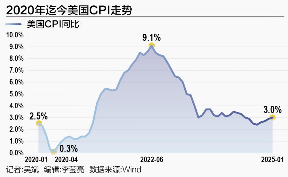 美国总统特朗普关税政策的影响尚未显现,通胀压力就已经意外“爆表”。 当地时间2月12日,美国劳工部公布的数据显示,美国1月CPI全线超预期,环比上升0.5%,创下2023年8月以来最大升幅,同比涨幅达到3%,时隔7个月重返“3时代”。 剔除食品和能源成本后,1月核心CPI同比上涨3.3%,高于预期的3.1%;1月核心CPI环比增长0.4%,为2024年3月以来最大增幅,高于预期的0.3%。 中航证券首席经济学家董忠云对21世纪经济报道记者分析称,美国通胀大幅超出预期源于多重因素,数据上看,1月食品、医疗护理、娱乐、教育与通信等商品及服务类分项环比有所抬升,但住房、交运环比持平,能源价格环比水平有所回落。往后看,本次通胀抬升存在部分短期因素的推动,但由于美国国内劳动力市场紧张状况短期内或难有大的改变,可能会令高通胀具有一定的持续性。 更大的风险或许还在前方,随着特朗普2.0席卷而来,“二次通胀”阴云压顶,美联储恢复降息“遥遥无期”,今年可能只有一次降息,甚至存在全年不降息或加息的可能性。