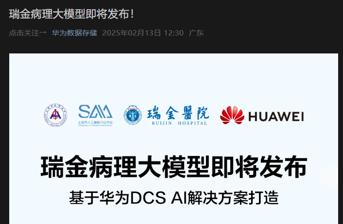消息面上,据华为数据储存公众号消息,基于华为DCS AI解决方案打造的瑞金病理大模型即将在2月18日举办的“2025医疗人工智能与精准诊疗发展论坛”上发布。