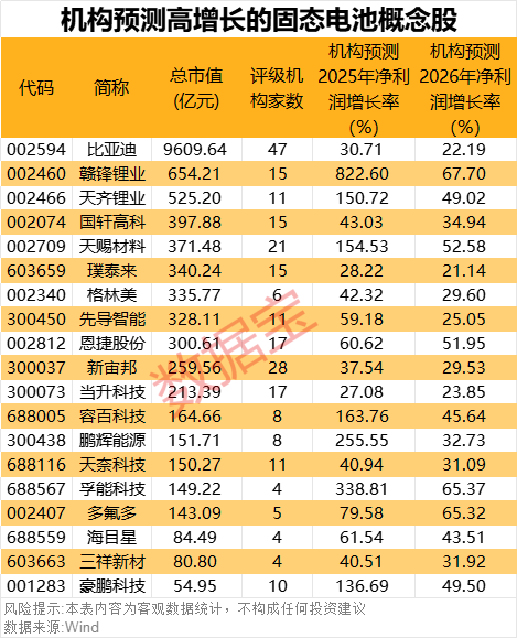 近期,固态电池产业催化不断。中国全固态电池产学研协同创新平台将于2月15日—16日举办2025中国全固态电池产学研协同创新平台年会。根据议程,中创新航、广汽埃安、宁德时代将进行主题发言。比亚迪、广汽AION、清陶能源、恩捷股份等电池厂均有参会。值得注意的是,全固态电池制造工艺及装备联盟将正式成立揭牌。 固态电池产业化持续推进 近期,国内固态电池大事不断,产业化持续推进。2月9日,长安汽车发布金钟罩固态电池,产品能量密度可达到400Wh/kg,满电状态续航超1500km。较多车企进一步明确固态电池的量产节点,全固态有望进一步提速,2026年上车,2027年实现全面量产。 长安计划:2025年底实现固态电池的功能样车首发,2026年实现固态电池装车验证,2027年推进全固态电池逐步量产,固态电池产业化持续推进。 比亚迪:计划在2027年小批量生产固态电池,并在2030年实现大规模应用。 上汽集团:计划2026年四季度实现全固态电池量产,上汽清陶首条全固态电池量产线将于2025年年底完工。 广汽集团:计划2026年实现全固态电池装车,并率先搭载在昊铂车型上。 奇瑞汽车:计划2026年实现固态电池的定向运营,2027年批量上市鲲鹏固态电池。 一汽集团:计划2027年实现小规模示范性量产全固态电池。 清陶能源:第一代半固态电池已实现量产;第二代固态电池2024年开始量产,2025年将有多款车型搭载;第三代全固态电池正在验证中,预计2027年量产装车。 据报道,中国电动汽车百人会副理事长兼秘书长张永伟表示,目前国内半固态电池技术先行,2025年具备固态电池技术内容的出货量(包括车载与非车载领域)有望突破10GWh;全固态电池当前处于核心技术突破和验证阶段,有望在未来2年至3年完成小批量上车。 “整车厂已经投资固态电池,传统电池企业更不会放弃,电池行业新势力也在靠固态新赛道力图重塑电池产业格局。”他认为,材料、设备企业已有足够的力量和资本进入到固态电池领域,全固态技术产业化周期在快速缩短。 19只高增长潜力股获机构看好 根据高工产业不完全统计,我国2021年至2024年固态电池行业投扩产规划金额超2000亿元,从产能来看,固态电池已有产能超过15GWh,规划产能超过400GWh,固态电解质投产产能超过1GWh,规划产能超过10GWh。 固态电池的发展将带动上游原材料(如锆、镧、钛等)和中游材料(如高镍三元正极、硅碳负极等)的需求增长,形成产业链协同效应。五矿证券指出,固态电池技术持续突破,尤其是全固态电池在安全性、能量密度方面具有显著优势。随着技术成熟和规模化生产,成本有望大幅下降,未来市场潜力巨大。 截至2月13日收盘,A股万得固态电池指数42只成份股中,比亚迪、新宙邦、格林美、硅宝科技、当升科技、宁德时代等11只个股滚动市盈率低于30倍。 从未来增长潜力来看,根据3家以上机构一致预测,2025年、2026年净利润增速均有望超20%的概念股有19只,赣锋锂业、孚能科技、鹏辉能源、容百科技、天赐材料净利润增速均值靠前。
