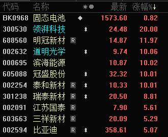 固态电池技术持续突破。 固态电池概念活跃 2月14日早盘,固态电池概念拉升,领湃科技连续2个交易日20cm涨停。明冠新材大涨超10%,道明光学、滨海能源、冠盛股份、泰和新材均涨停,瑞泰新材、江苏国泰、三祥新材、比亚迪等纷纷大涨。 领湃科技具有“固态电池+充电桩+湖南国资”概念,公司以“领湃新能源”作为公司动力电池业务板块品牌。公司曾在投资者活动关系记录中表示,固态电池是未来技术发展的重要方向,公司对相关技术给予了高度关注,并投入资源进行技术储备。公司最终控制人为衡阳市人民政府国有资产监督管理委员会。
