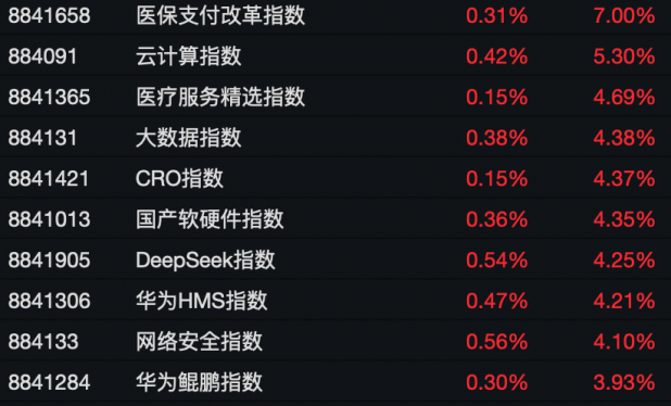 科技股强势 春节以来,科技股持续保持强势。盘面上看,今日A股云计算、大数据、国产软件、DeepSeek、华为HMS等多个概念指数涨幅居前。个股方面,云创数据“30cm”涨停,易华录、飞利信等“20cm”涨停,科华数据、数据港、神州数码、梦网科技、拓维信息等涨停,优刻得、深信服、并行科技等多股涨超10%。