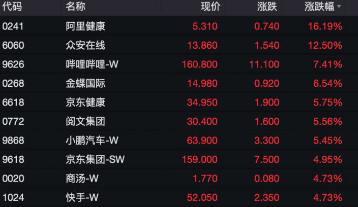 2月13日晚间,青云科技发布两则涉及减持股份结果的公告。其中一则公告称,公司于近日收到股东嘉兴蓝驰、天津蓝驰出具的告知函,截至2025年2月12日,本次减持计划实施期间已届满,在减持计划期间内,嘉兴蓝驰、天津蓝驰通过集中竞价及大宗交易方式合计减持公司股份95.58万股,占公司目前总股本的2.00%,本次减持计划已实施完毕;另一则公告则显示,横琴招证睿信投资中心(有限合伙)(简称“横琴招证”)的减持计划也已实施完毕,在减持计划期间内,累计减持公司股份47.80万股,占公司目前总股本的1.00%。 港股科技股更是表现强势,恒生科技指数涨幅超过3%。成份股中,阿里健康、众安在线涨超10%,哔哩哔哩涨超7%,京东健康、阅文集团、小鹏汽车等涨超5%。