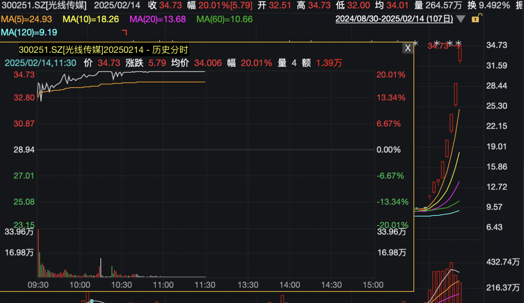 华虹半导体昨晚发布的公告显示,2024年第四季度,公司销售收入5.392亿美元,同比增长18.4%,环比增长2.4%,毛利率11.4%,同比上升7.4个百分点,环比下降0.8个百分点。 2024年第四季度,华虹半导体母公司拥有人应占损失2520万美元,上年同期母公司拥有人应占溢利为3540万美元,上季度母公司拥有人应占溢利为4480万美元。公司预计2025年第一季度销售收入在5.3亿美元至5.5亿美元之间,预计毛利率在9%至11%之间。 华虹半导体总裁兼执行董事白鹏表示,公司2024年第四季度销售收入为5.392亿美元,单季度毛利率为11.4%,均符合指引。2024年全年实现销售收入20.04亿美元,全年毛利率为10.2%。白鹏表示,对华虹半导体而言,2024年是挑战与机遇并存的一年。市场需求复杂多变,消费领域复苏、部分新兴应用市场快速成长,带动公司图像传感器、电源管理等平台表现良好,但中高端功率器件的需求仍待改善。面对激烈的市场竞争,公司仍保持了营收与产能的稳定,整体业绩呈现逐季提升趋势。全年平均产能利用率接近100%,在全球晶圆代工企业中处于领先水平。 光线传媒继续大涨,2月以来已暴涨超过260% 光线传媒继续大涨,连续第5个交易日“20cm”涨停,今年2月以来光线传媒股价已经暴涨超过260%。