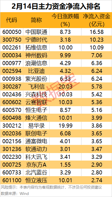 今日仅2个行业主力资金净流入。 据证券时报·数据宝统计,今日沪深两市主力资金净流出314.25亿元,其中创业板净流出82.2亿元,沪深300成份股净流入5.03亿元。 行业板块方面,申万一级行业中,14个行业上涨,计算机行业涨幅居首,达3.52%,医药生物涨2.41%。还有传媒、通信、汽车和电力设备等行业跟涨。17个下跌行业中,房地产行业跌幅居首,为1.42%;建筑材料、综合、商贸零售、钢铁和纺织服饰等行业微跌。 从资金流向来看,仅2个行业主力资金净流入,计算机行业净流入居首,达78.2亿元;医药生物行业居次席,为27.91亿元。 29个主力资金净流出的行业中,两个行业净流出金额超50亿元,电子行业净流出金额居首,达67.62亿元;机械设备行业净流出64.38亿元。传媒、家用电器、商贸零售、钢铁等行业净流出金额均超20亿元。 3只龙头股获主力资金出手超10亿元 从个股来看,今日共有85股主力资金净流入超1亿元,其中34股净流入均超2亿元。 3只龙头股净流入金额超10亿元。中国联通主力资金净流入金额居首,达16.58亿元。该股今日盘中触及涨停,报收5.98元/股,换手率5.09%,成交额93亿元。 近日,中国联通公布了最新的“5G-A行动计划”,正加速网络升级与商用部署,计划于2025年在39个重点城市的主城区全面启动5G-A业务,并在300余座城市的重点场景中逐步推广。 并且,中国联通将同步开启“5G-A星火计划”“5G-A百川计划”以及“融合创新终端生态联盟”,欲加强与产业链上下游的深度合作,推动5G-A产业生态的繁荣。 宁德时代主力资金净流入10.23亿元,居次席,净流入额创2024年11月13日以来新高,连续3日净流入,累计净流入21.06亿元。该股收涨3.18%,成交额达104.1亿元。 消息面上,公司计划赴港上市,进一步推进全球化战略,提升国际竞争力。市场情绪整体积极,政策和产业端的利好消息为公司未来的发展提供了有力支持。 拓维信息涨停,主力资金净流入金额为10.09亿元。近期市场对华为概念和DeepSeek概念的追捧,使得拓维信息成为市场热点。今日,DeepSeek概念再度活跃,多股涨停;该股同时作为华为概念的代表,受到资金追捧。 此外,还有神州数码、浪潮信息、比亚迪、紫光股份等主力资金净流入金额居前。
