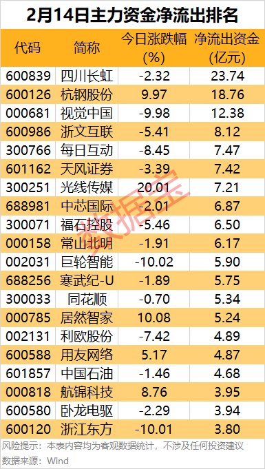 据数据宝统计,逾100股主力资金净流出超1亿元,其中14股净流出超5亿元。 3股净流出超10亿元,四川长虹主力资金净流出居首,达23.74亿元。该股今日成交额138.72亿元,居A股市场首位。 2月13日,四川长虹宣布旗下AI TV正式接入DeepSeek,并支持在“深度思考(满血R1)”和“快速响应”两个版本间自由切换。 杭钢股份今日涨停,收获8连板,主力资金净流出18.76亿元。龙虎榜数据显示,机构合计净卖出6.22亿元。知名游资现身龙虎榜,方新侠(中信证券西安朱雀大街证券营业部)、华福证券南京胜太路证券营业部分别买入2.59亿元、1.5亿元;东亚前海证券上海分公司、开源证券西安西大街证券营业部分别卖出1.97亿元、1.33亿元。