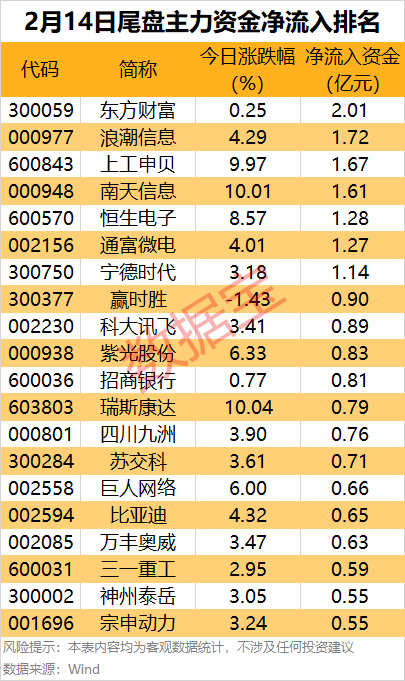 尾盘主力资金小幅回流 据数据宝统计,尾盘两市主力资金净流入17.49亿元,其中创业板尾盘净流入4.36亿元,沪深300成份股尾盘净流入16.74亿元。 从个股来看,40股尾盘主力资金净流入金额超4000万元,其中7股金额超1亿元。东方财富尾盘净流入居首,达2.01亿元;浪潮信息、上工申贝、南天信息尾盘净流入均超1.5亿元。 低空经济概念股尾盘异动拉升,上工申贝涨停,龙虎榜数据显示,上榜营业部席位全天成交3.83亿元,占当日总成交金额比例为15.5%。其中,买入金额为1.51亿元,卖出金额为2.31亿元,合计净卖出7990.21万元。