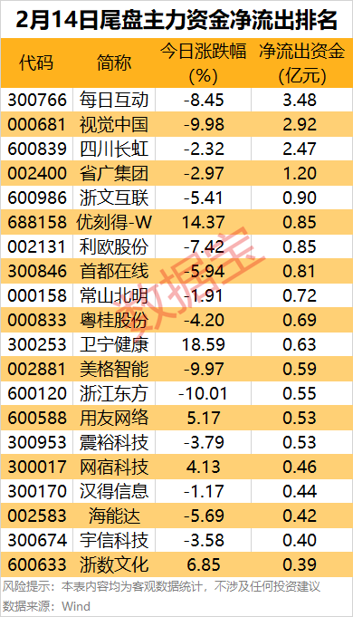 据数据宝统计,15股尾盘主力资金净流出超5000万元,其中4股尾盘净流出金额超1亿元。 热门股每日互动尾盘净流出金额居首,达3.48亿元。视觉中国跌停,尾盘主力资金净流出2.92亿元。