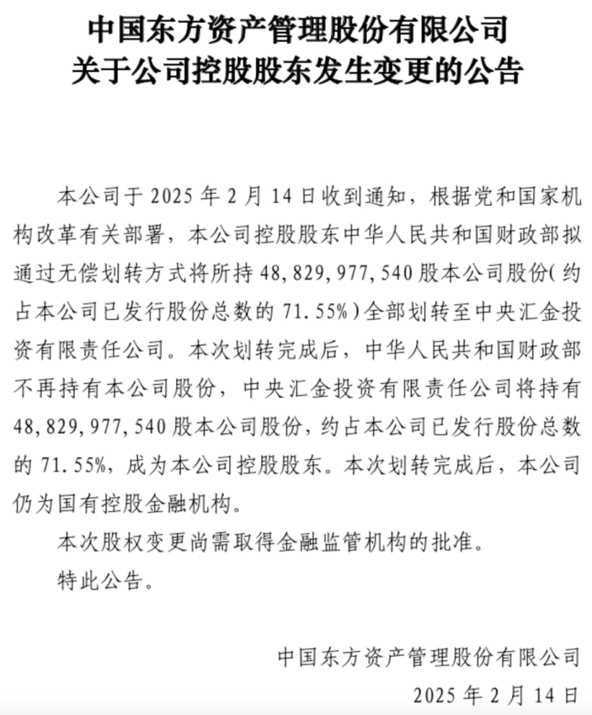 资料显示,长城资产成立于2016年12月11日,注册资本512.3亿元,由中华人民共和国财政部、全国社会保障基金理事会和中国人寿保险(集团)公司共同发起设立,前身是国务院1999年批准设立的中国长城资产管理公司。 同日,中国东方资产管理股份有限公司(简称“东方资产”)发布关于公司控股股东发生变更的公告,本公司于2025年2月14日收到通知,根据党和国家机构改革有关部署,本公司控股股东中华人民共和国财政部拟通过无偿划转方式将所持488.3亿股股份(约占公司已发行股份总数的71.55%)全部划转至中央汇金。