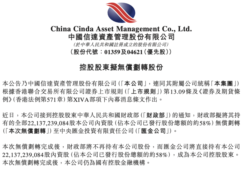 资料显示,东方资产是经国务院批准,由中华人民共和国财政部、全国社会保障基金理事会共同发起设立的中央金融企业。东方资产前身为中国东方资产管理公司,成立于1999年10月,于2016年9月改制为股份有限公司。自成立以来,东方资产始终以“保全国有资产、化解金融风险、促进国企改革”为使命,将依法合规经营作为生命线,累计管理处置各类不良资产2万多亿元,为国家金融系统的稳定作出了积极贡献。 中国信达也在港交所发布公告称,控股股东财政部拟将其持有的221.37亿股公司内资股(占公司已发行股份总额的约58%)无偿划转至中央汇金。无偿划转完成后,财政部将不再持有公司股份,中央汇金将直接持有公司221.37亿股内资股,成为公司控股股东。