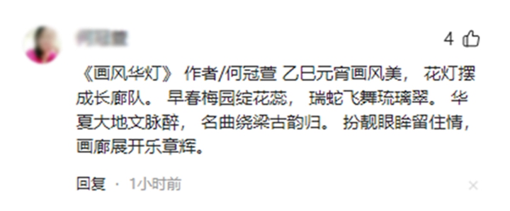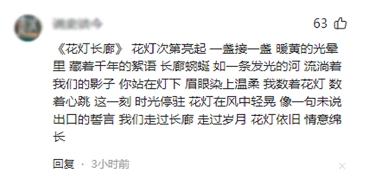 正月十五元宵节 新华网“打造”了一条“花灯长廊” 邀请广大网友一起赏花灯 ![]() 三亚玫瑰灯 菏泽牡丹灯 镇江草莓灯 天水苹果灯 咸宁蔬菜灯 …… 新华网选取了这些年 习近平总书记在地方考察时 关注的一些“土特产” 运用AI技术设计了各种创意花灯 ![]() 用最新的科技手段 展现中国传统文化的魅力 和乡村振兴的活力 这条极具特色的长廊 引发了广大网友的广泛关注 网友们纷纷为“土特产”点赞 为更具活力的乡村点赞 ![]() 三亚玫瑰、菏泽牡丹 特色产业带动农民增收 镇江草莓、伊春蓝莓 小特产蕴含大希望 ![]() 网友们纷纷留言 这些“土特产”是乡村振兴的重要力量 总书记指引了发展的方向 要跟着总书记的指引 把“土特产”产业做得更出色 ![]() 小小“土特产” 一头连着农民增收 一头连着美好生活 蕴含着浓浓乡情 也寄托着总书记的殷殷期望 ![]() 有网友说 花灯长廊中的每一盏灯 都仿佛在诉说着一个个动人的故事 ![]() 还有网友说 花灯长廊,情深意长 每一盏花灯 都是人们对美好生活的向往 ![]() 还有网友说 这种匠心独运的设计 创意十足的表达方式 让他感受到了传统文化的深厚底蕴 感受到了温暖和力量 ![]() ![]() ![]() ![]() 甚至有网友 为这条挂满“土特产”的花灯长廊 写起了散文 作起了诗 ![]() 花灯次第亮起 一盏接一盏 暖黄的光晕里 藏着千年的絮语 长廊蜿蜒 如一条发光的河 流淌着 我们的影子 你站在灯下 眉眼染上温柔 我数着花灯 数着心跳 这一刻 时光停驻 花灯在风中轻晃 像一句未说出口的誓言 我们走过长廊 走过岁月 花灯依旧 情意绵长 ![]() 花灯长廊映春枝,情深意长韵满池。 盏盏华光添瑞彩,层层暖意入心脾。 人流熙攘同欢处,笑语飞扬共乐时。 佳节良辰歌盛世,团圆愿景寄相思。 ![]() 乙巳元宵画风美,花灯摆成长廊队。 早春梅园绽花蕊,瑞蛇飞舞琉璃翠。 华夏大地文脉醉,名曲绕梁古韵归。 扮靓眼眸留住情,画廊展开乐章辉。 不得不说 网友们真是太有才 太招人喜欢了! 还有很多网友 留言表达了自己对“土特产”的喜爱 ![]() ![]() 无论是带动很多人发家致富的 菏泽牡丹 还是深受广大人民群众喜爱的 沙县小吃、柳州螺蛳粉 是街头烟火 更是百姓的生活 花灯各色各样 每一盏背后 都代表着一个“独甲一方”的特色产品 每一种“土特产” 都刻画着乡村振兴的美丽愿景 许多地方媒体、政务账号 纷纷转发宣介本地“土特产” ![]() 还有很多很多网友 给中华优秀传统文化点赞 ![]() ![]() ![]() 网友们纷纷在文章后 留言祝福 祝福节日快乐 祝福人间温暖 祝福盛世中华,家国两圆! ![]() ![]() 最后 借用网友的话 祝福大家: 一元复始,万象更新。 花灯长廊,月圆人安。 新的一年,新的开始。 努力奋斗,万事胜意。 责编:欧小雷 一审:欧小雷 二审:蒋俊 三审:谭登 来源:新华网 |