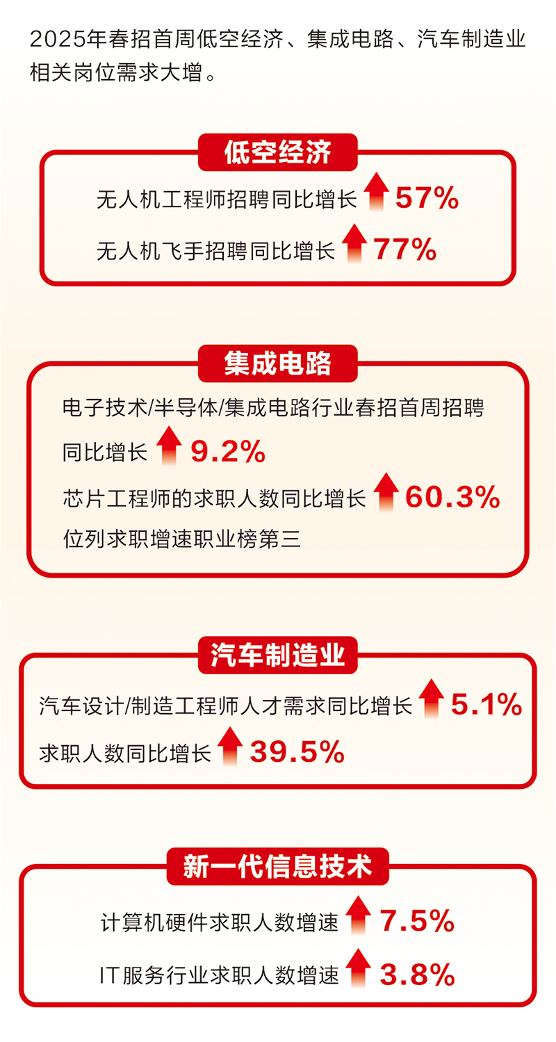 证券时报记者 卓泳 张淑贤 蛇年春节开工,各地马不停蹄召开了一场又一场的新春招聘会,伯乐和千里马“双向奔赴”,为产业发展注入新动能。 证券时报记者走访深圳、广州、上海等地的新春首场招聘会,浏览主流招聘平台,发现今年求职者的活跃度明显高于往年,打破往年春节后十天才出现求职高峰的惯例。智联招聘监测数据显示,38个重点城市中,苏州、烟台、北京、济南、合肥、宁波、杭州、海口、珠海、哈尔滨等城市春招首周求职同比增速位列前十。 与此同时,随着科技创新的蓬勃发展,以人工智能、低空经济等为代表的大量新技术岗位不断涌现。AI技术的广泛应用,也正悄然重构企业的用工模式和用人结构。 1 新兴行业扩张 岗位需求激增 一般来说,企业招聘的岗位和员工数量,会随着订单和产能的变化而变化。证券时报记者走访多地新春招聘会了解到,大部分企业对今年的发展预期相对平稳,对岗位和员工数量需求与去年基本持平或略有增长。 “我们年前的订单比较多,所以对人员需求略有增加。”白云电器招聘负责人对记者表示。专业从事各类片式电子元器件研发、生产和销售的上市公司顺络电子一招聘人士表示,公司近几年招聘规模相对稳定,每年年初招聘人数约在四五百人,主要集中在基层岗位。“今年订单量比较稳定,用工需求还有所提升。”该公司现场招聘负责人表示。 记者走访发现,相较于传统行业招聘规模的相对稳定,甚至有所缩减,不少聚焦新兴产业的公司却随着业务的扩张而大幅增加用工人数。在深圳的首场新春大型招聘会上,联赢激光的招聘窗口前,应聘者排起了长队。记者从该公司人力资源部门了解到,为配合公司业务扩张,公司一季度计划招聘500—600人,较去年增长100%,重点聚焦研发创新与技术应用型人才。 在广州新春首场大型招聘会上,广州国机智能橡塑密封科技有限公司的摊位吸引了许多求职者驻足咨询。该公司现场招聘负责人林女士对记者介绍,公司于2018年由广州机械研究院密封事业部转制而来,专注于新能源汽车动力电池极柱密封的研发、生产和销售,随着新能源汽车行业的高速发展,公司业务快速扩张。“我们订单充裕,工厂满负荷运作,拟招聘员工100多名。” 林女士说。 科锐国际高级市场总监刘萌萌在接受证券时报记者采访时表示,开工首日,公司服务的重点客户都更新或新增了重点岗位招聘需求。“抢人大战已然开启,企业希望在一季度奠定人才优势。”刘萌萌说。 薪酬方面,多家受访企业表示,今年的薪资与去年持平,但对于公司重点发展的岗位,会给予一定幅度的激励倾斜。“岗位薪酬主要向关键岗位及晋升岗位倾斜,比如人形机器人、低空经济、人工智能等高精尖领域技术带头人及技术骨干等,同时兼顾其他岗位薪酬的适度增长,以保持竞争力和内部公平。”广电计量人力资源有关负责人对记者表示。 也有企业反映,“技术+外语+项目管理”三栖人才的薪酬溢价高达50%。据刘萌萌观察,企业不再像过去那样虚增工资,薪酬与人才供需水平及实际能力相匹配。求职者也变得更加谨慎,他们更看重稳定性,对行业赛道的稳定性和企业前景的重视程度甚至超过了对薪资和工作地点的要求。 2 新兴岗位涌现 出海人才需求旺盛 为适应产业结构转型升级,以及新技术、新产业的崛起,许多企业都调整了组织架构和岗位结构,以抢先布局紧抓新机遇。 “我们今年的岗位结构有调整,主要增加低空经济、人形机器人、人工智能、数字经济等方向的研发技术人才储备。”广电计量人力资源有关负责人对记者表示,岗位结构调整主要原因是检测行业竞争日益激烈,公司必须寻求新的突破,抢占新兴赛道,增添企业发展的新动力。 华勤技术人力资源总监熊安琛表示,公司正在积极拓展机器人、软件和汽车电子业务,构建全球智能产品大平台,因此在人才需求上也侧重于以技术驱动和新业务发展要求为主的技术型人才,比如硬件、音频、光学、AI服务器、机器人、智驾、智能座舱等方面的专业人才。 记者在招聘会现场发现,人工智能、先进制造等企业专区人潮涌动,颇受大学毕业生及年轻求职者欢迎。计算机专业毕业的求职者小黄接受记者采访时表示:“毕业一年多了,还在犹豫是考研还是工作,看到今年的人工智能很火,就过来看看有没有合适的岗位。” 值得注意的是,春节期间火爆出圈的两家科技公司宇树科技和深度求索(DeepSeek)均在近期开出百万年薪招聘多个关键技术岗位,点燃了国内人工智能就业市场。 求职者对新兴岗位的需求也侧面反映出当前产业结构的变化和趋势。根据智联招聘近期发布的《2025年春招市场行业周报(第一期)》(以下简称《报告》),2025年春招首周,低空经济、集成电路、汽车制造业相关岗位表现突出。其中,低空经济领域的无人机工程师、无人机飞手招聘分别同比增长57%、77%。电子技术/半导体/集成电路行业春招首周招聘同比增长9.2%;芯片工程师的求职人数同比增长60.3%,位列求职增速职业榜第三。新能源汽车市场增长,相关的汽车设计/制造工程师人才需求同比增长5.1%,求职人数同比增长39.5%。 同样作为战略性新兴产业,新一代信息技术中的计算机硬件、IT服务行业求职人数,分别以7.5%、3.8%的增速入围行业前八。从细分领域看,通信及硬件研发、运维支持求职人数同比增超三成。《报告》还显