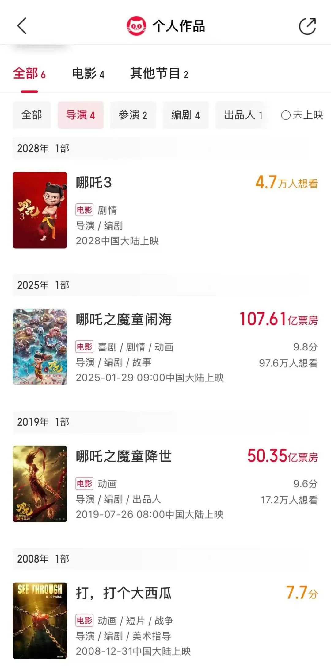 值得一提的是,在该榜单当中,大多数导演都是凭借两位数的作品登上榜单,只有饺子一位导演只凭借个位数作品登顶。细看饺子作品,其电影作品显示为4部,其中《哪吒3》还未上映。剩下3部电影为《哪吒之魔童闹海》《哪吒之魔童降世》《打,打个大西瓜》,其中,仅“哪吒”系列的两部作品显示了票房数据。
