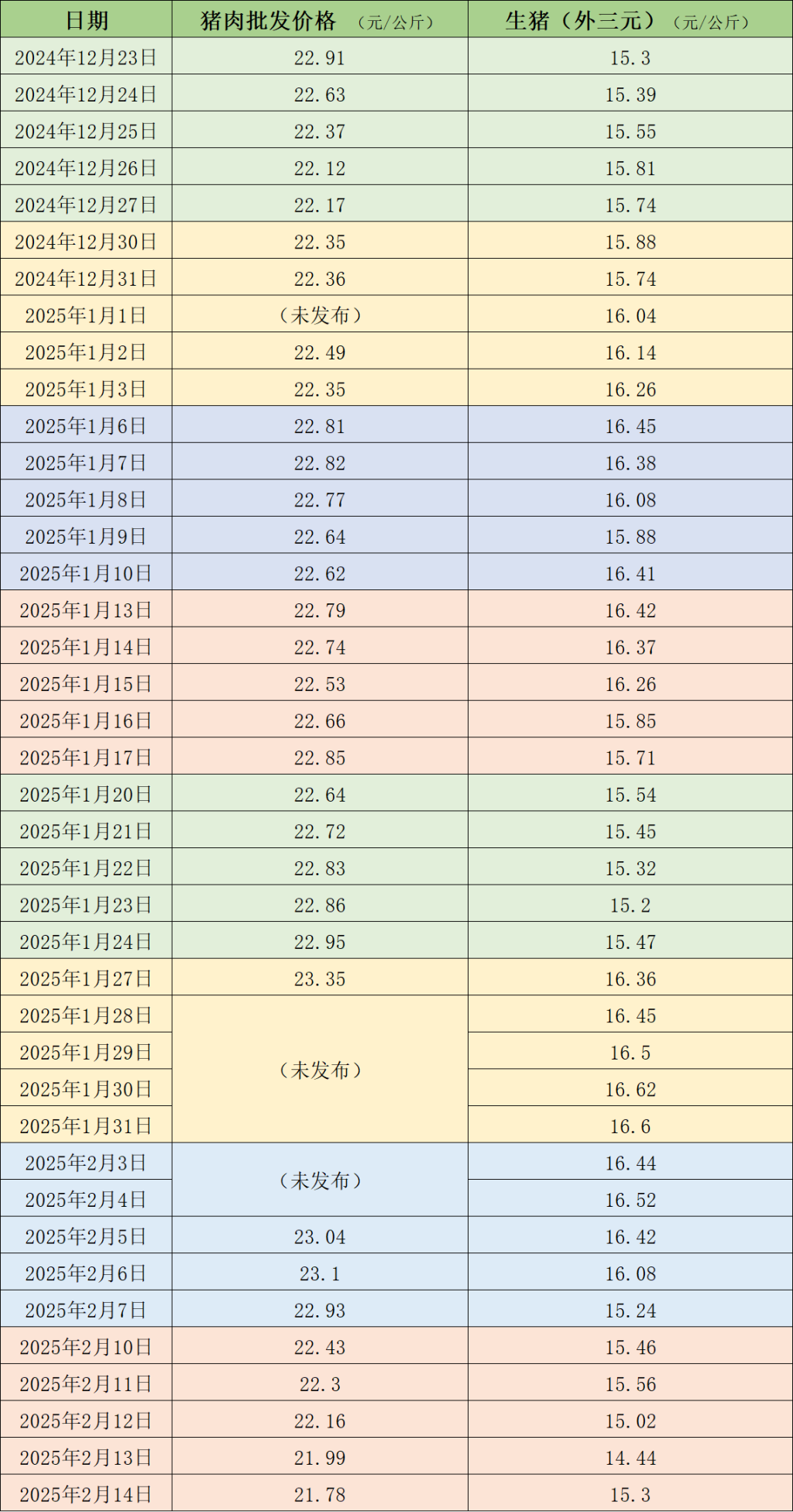 据农业农村部监测,2月14日,全国农产品批发市场猪肉平均价格为21.78元/公斤,与上周五(2月7日)的22.93元/公斤相比,下降5%。本周的平均价格为22.13元/公斤,与上周23.02元/公斤的均价相比,下降3.9%。 本周国内生猪周均价环比下跌。据中国养猪网的数据,2月14日,生猪(外三元)价格为15.3元/公斤,与上周五(2月7日)的15.24元/公斤相比,上涨0.4%。从一周均价来看,本周生猪均价为15.16元/公斤,与上周16.14元/公斤的均价相比,下降6%。 ![]() 近期的猪肉和生猪价格。制表澎湃新闻 据卓创资讯监测,本周全国生猪交易均重继续上涨。全国生猪平均交易体重123.57公斤,环比涨0.34%。饲料成本低位,生猪养殖成本偏低,加之大猪存栏紧张导致肥标价差持续走阔,市场压栏增重意愿偏强带动出栏均重上涨。同时,周后期部分地区二次育肥启动,小体重生猪价格止跌反弹,屠企收购成本提升,被动收购大猪作为替代,带动生猪收购均重上涨。本周国内生猪重点屠宰企业开工率上涨,周内平均开工率25.50%,环比上涨4.01个百分点。养殖企业生猪出栏逐渐增加,同时在元宵节、学校开学等因素提振下,屠宰企业订单缓慢恢复,屠宰企业开工率提升。后期终端需求恢复缓慢,预计下周开工率或小涨。 2月14日,国家统计局发布2025年2月上旬流通领域重要生产资料市场价格变动情况。其中,生猪(外三元)2月上旬价格为15.0元/公斤,与1月下旬相比,每公斤下降0.6元,下降幅度为3.8%。 迈科期货认为,年后猪价快速下跌,养殖端等待二次育肥抄底机会的意愿较强,散户惜售情绪加重,集团场也出现一定提价缩量行为。近期二次育肥补栏积极性有所增强,但是生猪价格抬升后,白条价格跟涨引发终端走货难度提升,贸易商订货谨慎。整体看,目前除了二次育肥以外,需求端整体对价格支撑力度较弱,预计现货猪价或将稳中偏弱调整。 卓创资讯预计未来一周全国行情或呈先降后涨再小降态势。供应方面,生猪养殖集团出栏节奏平稳为主,增量空间不大,但目前下游客户订单未明显增加,因此生猪市场涨价空间有限。供需仍然处于博弈状态,涨价后市场接受度不高,养殖端为保证正常出栏节奏,有降价出猪动作;但北方规模集团降至14元/公斤附近时集团或抗跌提涨,未来一周或如此循环。需求方面,屠宰企业宰量温和恢复,二次育肥需求较前期增加,对行情有一定支撑效果。