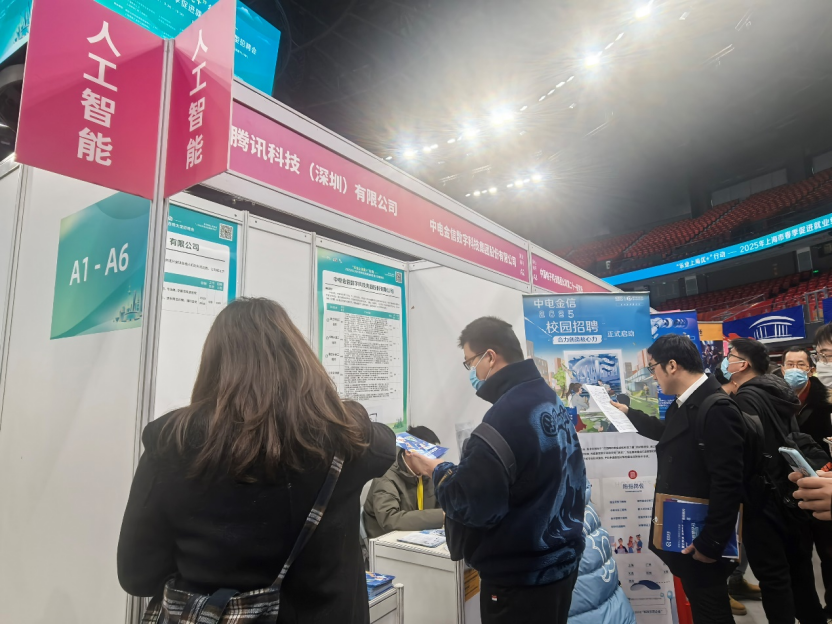 记者在招聘会主会场看到,其共设立了12个专区,涵盖人工智能、生物医药等重点行业。其中,最引人注目的当属首个专区——当前炙手可热的“人工智能”行业。互联网科技公司巨头腾讯、A股上市公司星环科技以及大模型独角兽企业阶跃星辰和无问芯穹均在此“摆摊”招人,招聘岗位包括大模型训练平台工程师、架构开发工程师、全栈开发工程师等。