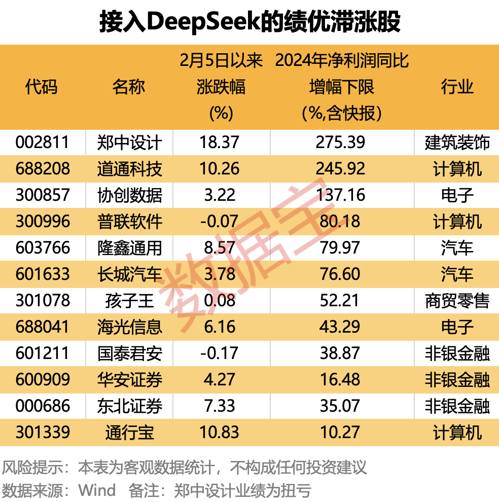 6只绩优滞涨股获国家队持股 从业绩维度来看,按照业绩预告分类(含快报,根据业绩类型合并至预告),自2月5日至14日,上述98家公司中,业绩扭亏的个股平均涨幅接近60%,业绩首亏的个股平均涨幅33%左右,业绩预减的个股平均涨幅30%左右。 从具体个股来看,涨幅位居首位的并行科技2024年业绩扭亏;另一只扭亏股弘信电子2月5日以来涨幅超过50%。业绩预增的莲花控股涨幅接近40%,道通科技股价涨幅超过10%。 在业绩扭亏、预增的19家公司中,部分公司股价滞涨。2月5日以来,股价涨幅低于20%的公司有12家,包括股价小幅下跌的国泰君安、普联软件以及扭亏股郑中设计。 这些滞涨股中,道通科技、协创数据2024年净利润同比增幅居前,按照净利润增幅下限计算,分别达到245.92%、137.16%;普联软件、隆鑫通用及长城汽车2024年净利润同比增幅下限均超过75%。 道通科技2月5日以来股价涨幅10%左右,公司AI团队已完成DeepSeek的全面接入和本地化部署,并应用DeepSeek训练流程,加速推进道通以“巡检垂域大模型”为核心的“空地一体解决方案”在能源、交通等领域的广泛推广。 协创数据2月6日在深交所互动易平台表示,公司近期发布的FCloud智能体训推创新平台产品,并服务于张江集团等多个企业;该平台已接入DeepSeek等大模型,为客户提供一站式的算力训练、推理服务。 需要补充的是,截至2024年三季度末,上述12股中,有6股获国家队持仓(含证金、汇金、社保基金等),长城汽车、国泰君安持股比例均超过3%,道通科技、普联软件、孩子王及东北证券获持股超过1%。