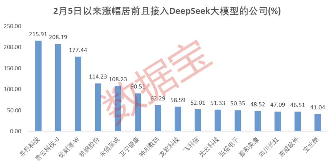 DeepSeek大热,风险与机遇并存。 自蛇年新春开市以来,A股刮起两股风,一是“哪吒风”,二是“DeepSeek风”。A股市场上,一场围绕着以DeepSeek为中心的投资盛宴火热开启,几乎沾上DeepSeek的公司均备受二级市场的追捧,并且受到一众国内上市公司的纷纷力挺。 从百度文心一言,到Kimi以及字节跳动的豆包,再到DeepSeek,中国大模型反复打破大众的固有认知,这一系列成功的背后,笔者借用《哪吒》系列电影中的经典台词——我命由我不由天。中国在全球科技领域的话语权更上一个台阶。 近百家公司接入DeepSeek 根据万得热门指数,截至2月14日,蛇年开市以来(2月5日起),DeepSeek指数(含接入DeepSeek大模型、以及与DeepSeek有合作的公司)累计涨幅超过48%,呈现断崖式领涨。 记者根据公开信息以及投资者互动平台信息梳理,截至2月14日,已有98家A股上市公司宣布接入DeepSeek大模型。然而,互动易的信息仍在持续更新中,意味着DeepSeek“朋友圈”将持续扩容。 从行业分布来看,上述98家公司既有属于计算机、传媒、电子、通信的TMT行业,也有包括食品饮料、有色金属、交通运输等传统行业。另外,以券商为主的非银金融行业公司数量也较多,包括广发证券、国金证券、国泰君安等。 从市场表现来看,自2月5日至2月14日,接入DeepSeek大模型的98家公司,区间平均涨幅超过25%,其中12家公司区间涨幅超过50%。 并行科技以超过215%的涨幅位居98家公司的首位;公司表示,其智算云平台已部署智谱清言、DeepSeek-R1等主流模型。 青云科技-U、优刻得-W、杭钢股份、永信至诚股价均翻倍,前2家公司相关产品已上线DeepSeek系列模型;杭钢股份全资子公司浙江省数据管理有限公司成功完成DeepSeek-R1的适配并实现DeepSeek-R1 70B参数及以下全部蒸馏模型的部署。 此外,神州数码、卫宁健康等公司的股价涨幅超过60%。 当然,并非所有接入DeepSeek大模型的公司均取得优异的表现,自2月5日以来,7家公司涨幅低于1%,其中酷特智能、国泰君安、普联软件2月5日以来逆势下跌。