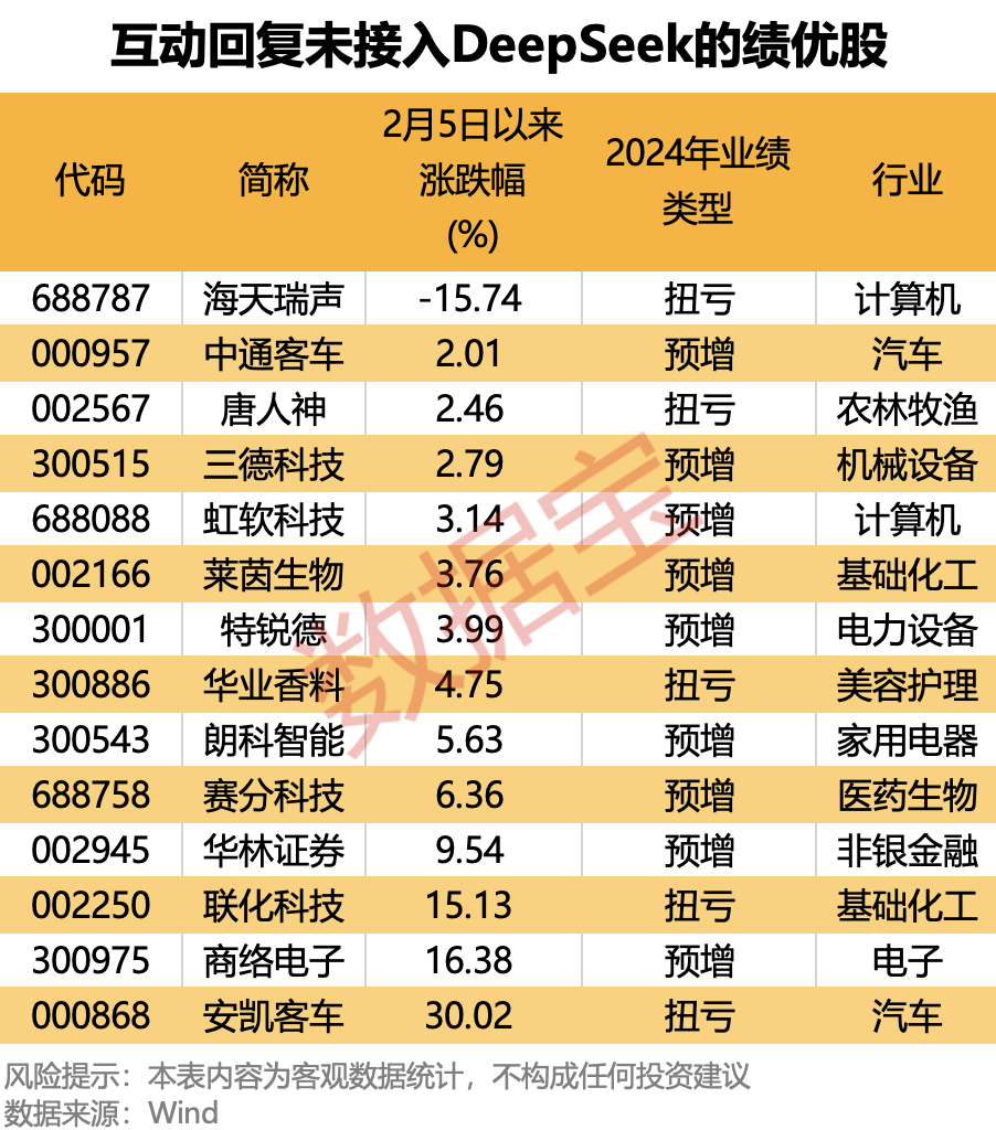 追捧DeepSeek 需警惕两大风险 DeepSeek已持续火爆数日,对资本市场而言,板块轮动是自然规律,任何概念板块均逃不出轮动法则,在资本狂欢的背后需警惕两方面的隐忧。 1. 过度炒作,股价偏离内在价值 经历了大涨之后,不少公司的股价已经偏离内在价值。以2月14日的市盈率来看,上述98家接入DeepSeek的公司中,最新市盈率较所属行业市盈率溢价20%以上的公司数量占比近四成。 例如,2月5日以来涨幅超过90%的永信至诚、卫宁健康滚动市盈率均超过75倍,2家公司所属的计算机行业市盈率为55倍左右。 涨幅均超过35%的莲花控股、有方科技滚动市盈率均为35倍以上,较行业市盈率均溢价35%以上,前者溢价高达200%以上。 尽管DeepSeek成为不少公司在二级市场的“致富武器”,然而从上文看出,接入DeepSeek大模型的上市公司股价表现明显呈现两极分化。 另外,技术从落地到成果转化并非一蹴而就的事情,尽管诸多公司宣告接入DeepSeek,但并非意味着能在短期内对公司经营带来增量,公司所属的行业赛道发展空间也很重要。估值能否提升,归根结底还看公司自身业绩的持续性,以及其在市场核心地位的稳固性。 根据历史经验,估值出现泡沫的情况下,会增加公司未来的投资风险。因此,投资者在追捧热点概念股的同时,需结合公司的估值以及业绩进行综合考量。 2. 60余家公司澄清未接入DeepSeek 在追捧DeepSeek概念股的同时,需警惕的第二大风险是:未接入DeepSeek的公司被投资者误认为与DeepSeek有一定的关联,或者误认为与DeepSeek有股权、技术等方面的合作。 记者根据投资者互动平台信息统计,澄清未接入DeepSeek的沪深两市公司有60余家。自2月5日以来,这些公司股价平均涨幅5%左右,其中安凯客车、盛通股份、创意信息等公司涨幅超过15%。 安凯客车2月12日在互动易回复投资者:公司暂未接入DeepSeek,不过由于公司2024年业绩扭亏,助力公司股价上涨。 科创信息回复投资者:公司暂未运用DeepSeek对外提供服务,目前正在就相关技术进行内部部署研究,并将积极探索与研究相关前沿技术。2月5日以来该股涨17.75%,不过公司2024年业绩呈续亏状态。 中科蓝讯回复投资者表示,已有充分的技术储备,其高端系列讯龙三代产品内置RISC-V CPU+HiFi 4高性能DSP,可满足音频类各种AI算法的应用开发,并结合双模蓝牙数据进行传输,可很好地连接到云端,以使用云端的大模型AI能力。 当然,上述未接入DeepSeek的公司中,不少绩优股值得关注。据证券时报·数据宝统计,以上公司中,2024年业绩预喜(扭亏、预增)的公司有14家,除安凯客车外,中通客车、唐人神、三德科技等均在列。